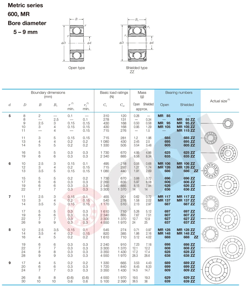 Миниатюрные и инструментальные шарикоподшипники могут быть разделены на два основных типа: глубокий паз и угловой контакт. Первый (глубокий паз) также может быть отнесен к категории «открытый», «экранированный» или «герметичный» в зависимости от наличия и типа уплотнения или щита. Глубокие шаровые подшипники имеют два присущего преимущества;Они могут выдерживать некоторые осевые нагрузки в любом направлении, а также радиальные нагрузки, И два поперечных сечения беговых дорожек являются простыми круглыми дугами, которые могут быть очень точно завершены, так что подшипники имеют низкое трение и очень маленький шум или вибрацию. Несколько различных конструкций клетки доступны с различными характеристиками и выбор зависит от индивидуального применения.