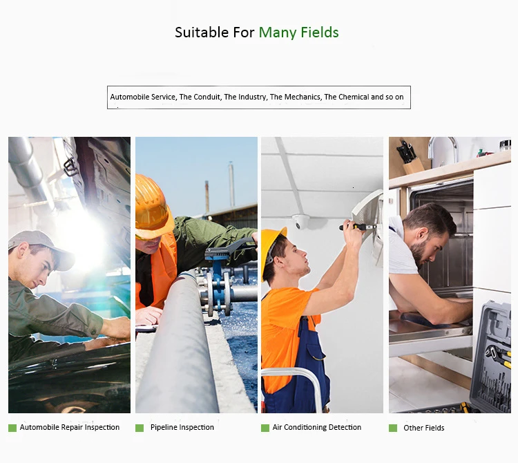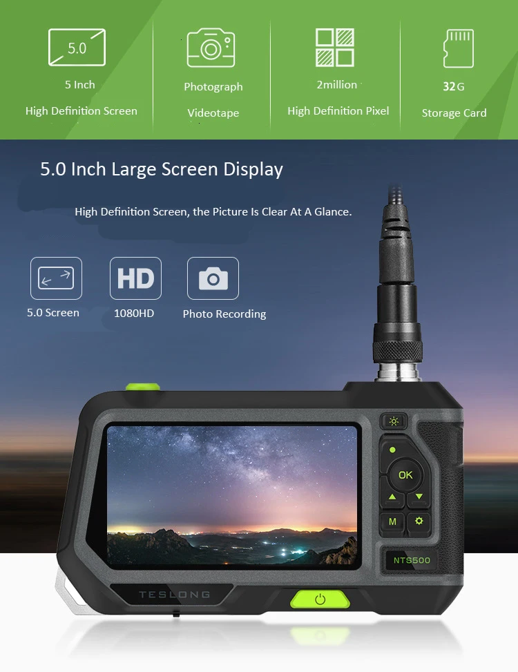 Монитор:Тип экрана: 5,0 дюймов Размер Цвет экранРазрешение: 1920*1080 пикселей (QVGA)Вращение: 360 °Разрешение камеры: 1920*1080Разрешение фото: 1920*1080Разрешение записи: 1280*720 1920*1080Язык: английский. Китайский, немецкий, французский, испанский, итальянский, русский, японскийПорт: Порт удаленного подключения, USB, слот для tf-карты32G TF SD картаКамера:Диаметр: 7,6 мм/5,5 мм/3,9 мм/12,5 мм опциональноДиаметр вала: 7 мм/5 ммДлина вала: 100 см/300 см/500 см (полу-жесткий кабель)Разрешение: 2,0 мегапикселейУгол обзора: 70 °Глубина поля: 30 мм-60 ммСветильник источник света: 6 Регулируемых светодиодов высокой интенсивностиПрочее:Светодиодный светильник вспышки: 1 Вт CREE светодиодныйРабочая температура: от 32 до 113 °F (от 0 до 45 °C)Мощность: 3500 мАч литиевая батарея (в комплекте)Срок службы батареи: 4-5 часовСертификат: CE FCC ROHS