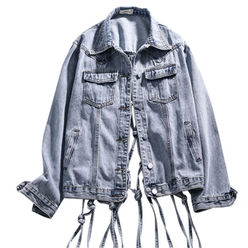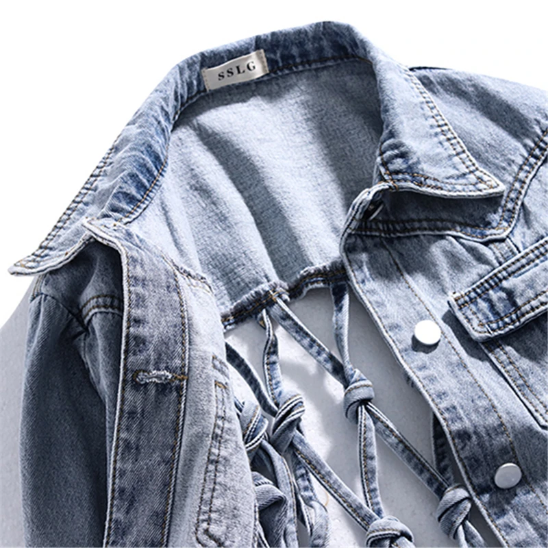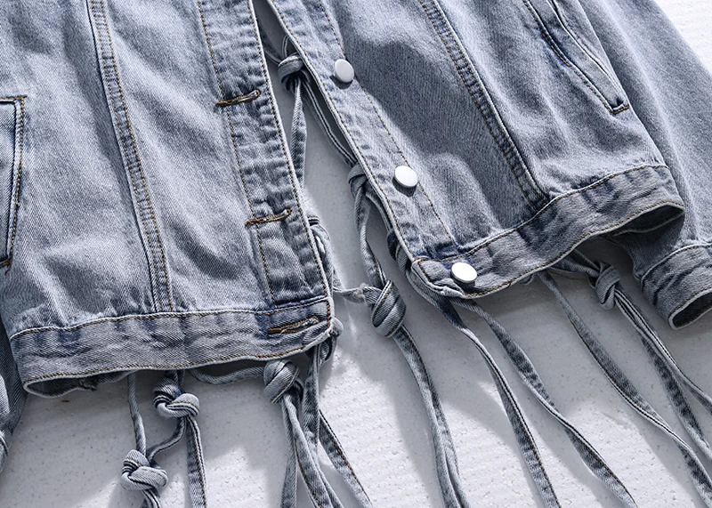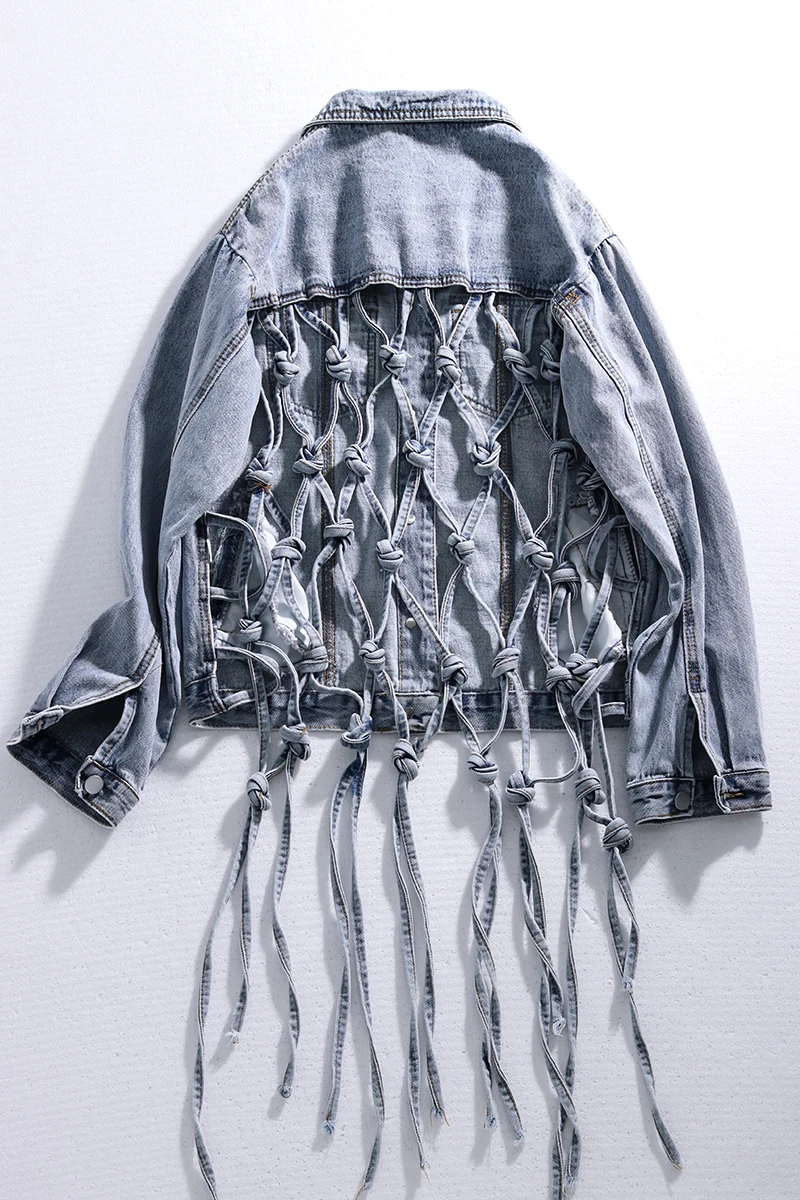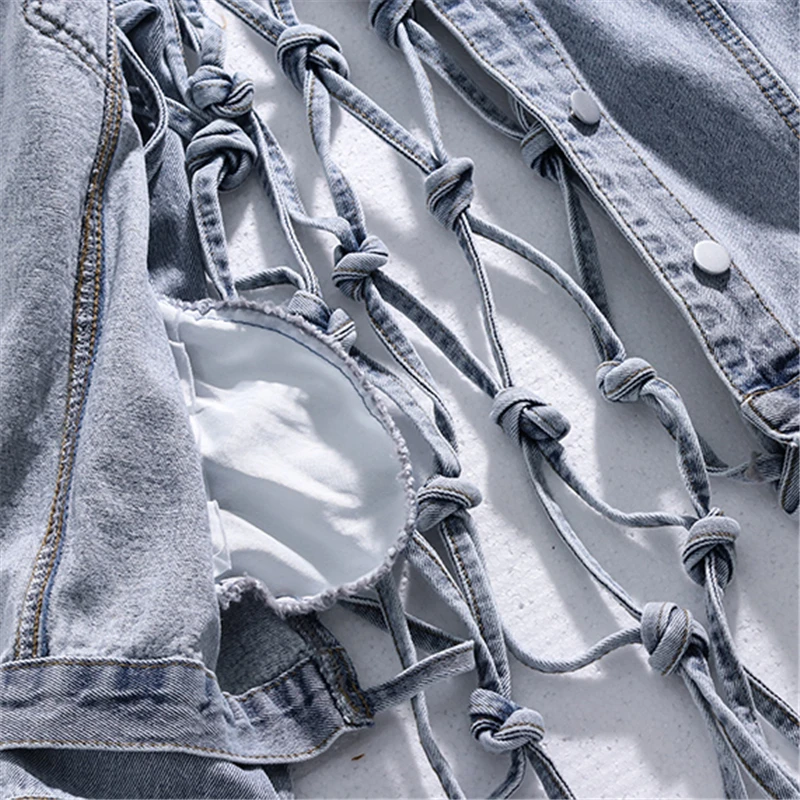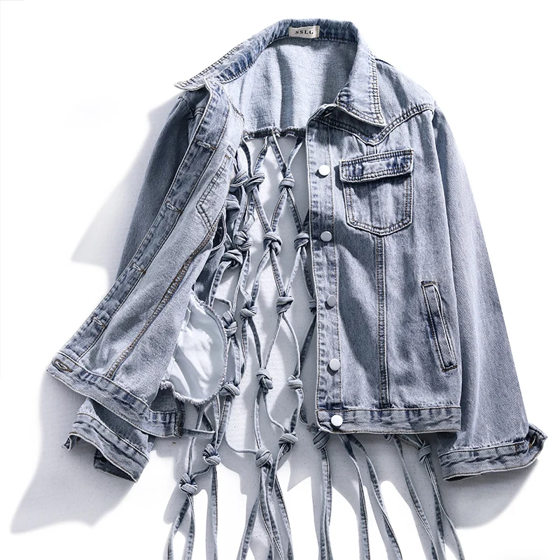 Женская джинсовая куртка с открытой спиной, красная свободная повседневная куртка из джинсовой ткани с ажурной сеткой и бахромой, 013, весна-лето 2020