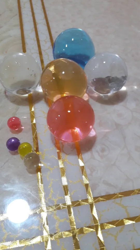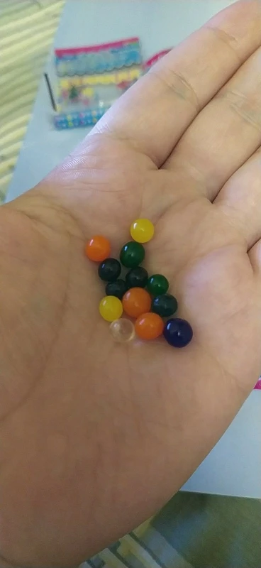 Заказ выслан оперативно и пришел быстро. 10 упаковок по 10-15 штук --- то есть с "запасом". Шарики после впитывания воды стали ровными. размер от 2-3 см до 5 см. Чем "водянистее" шар, тем легче его повредить. Смотрятся хорошо - прозрачные чистые цвета: желтый, оранжевый, красный, бирюзовый, изумрудный, голубой, синий. Все шары поместились в 2 л емкость. Спасибо продавцу. :)