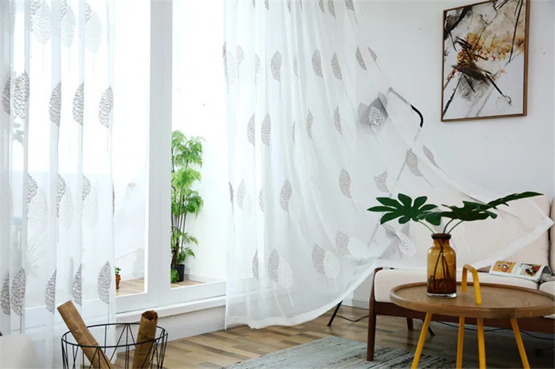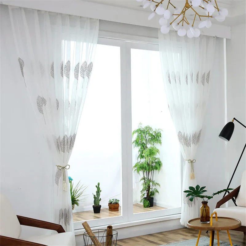 Белые тюлевые шторы с вышивкой для гостиной, спальни, оконные прозрачные шторы с серыми листьями, занавески, готовые