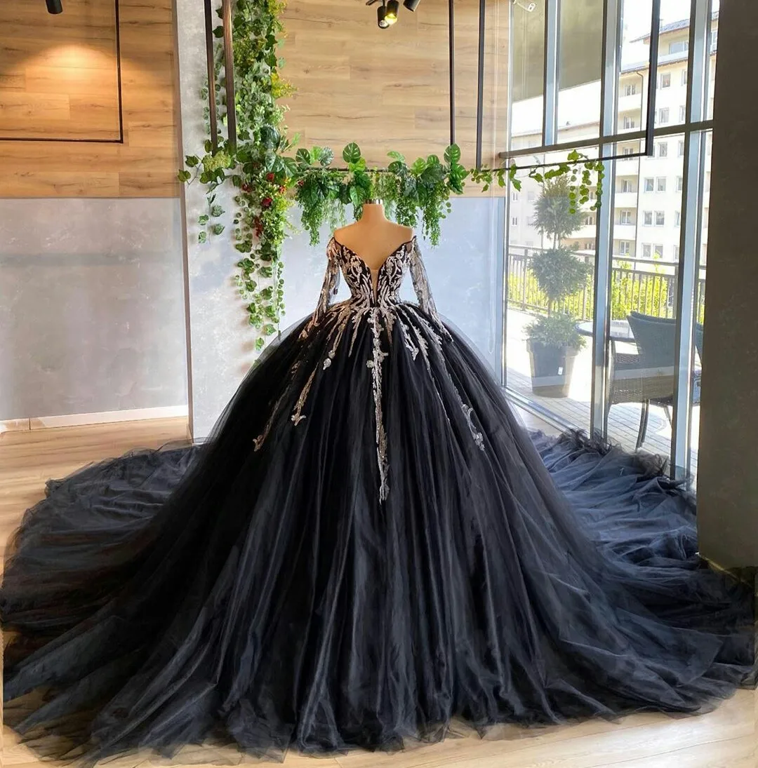 Черное бальное свадебное платье, сексуальное, с открытыми плечами, с длинным рукавом, кружевной аппликацией, свадебное платье, платья для невесты