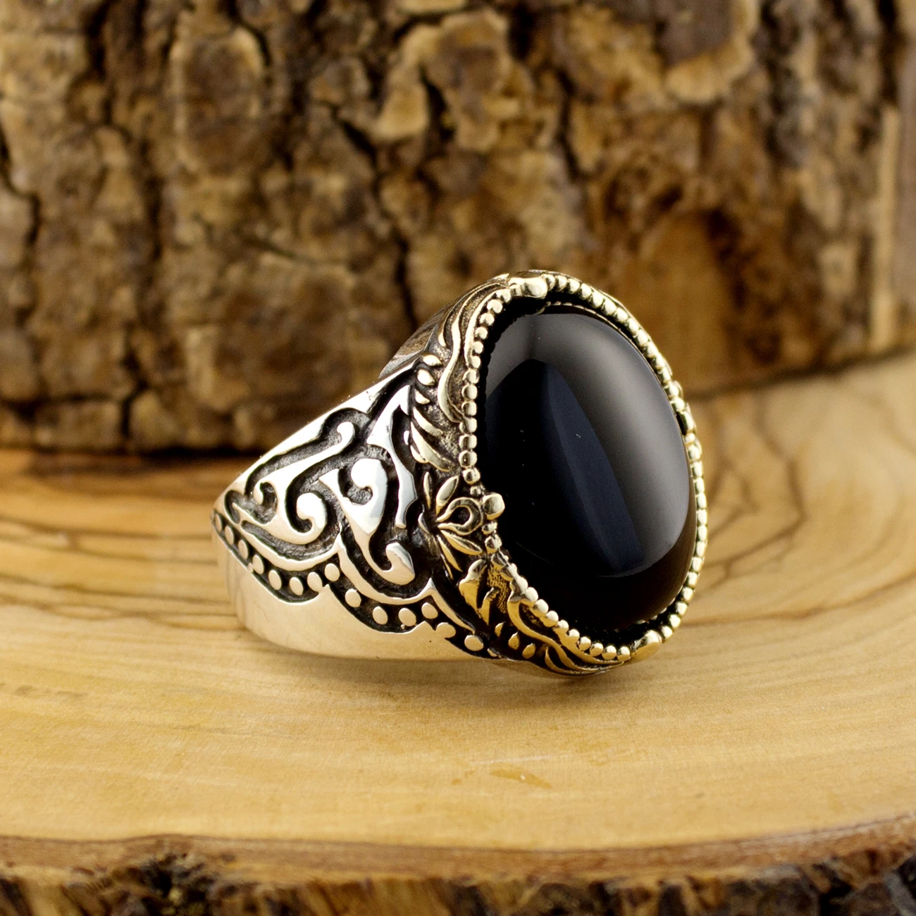Турецкий Стиль Чистый Настоящий Стерлингового Серебра 925 Натуральный Камень Кольцо Для Мужчин Женщин Высококачественные Ювелирные Изделия Панк Ретро Мода Старинные Подарок Ручной Работы Циркон Оникс Агат Аксессуар