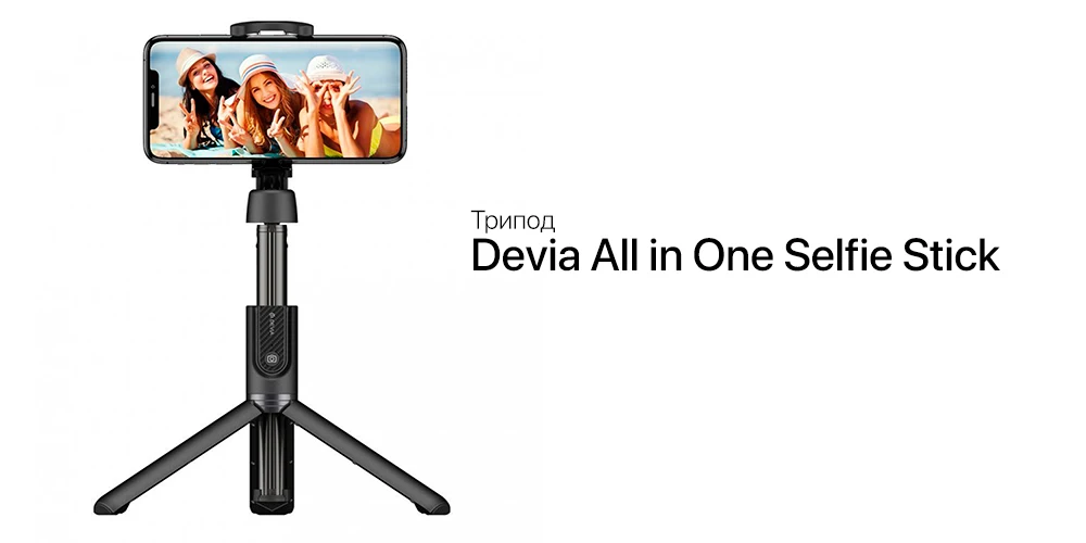 Трипод для селфи Devia All in One Selfie Stick. Монопод для селфиDevia All in One Selfie Stick подойдет для фотографирования, общения по видеосвязи и селфи. Конструкция модели предусматривает встроенный трипод. При помощи данного монопода вы сможете делать портретную фотосъемку, создавать групповые снимки, а также снимать видеообзоры. Устройство обладает стандартной для принадлежностей рассматриваемого типа расцветкой, представленной глубоким черным цветом. Devia All in One Selfie Stick используется совместно со смартфонами, функционирующими на базе операционной системы Android или iOS. Устройство изготовлено из сплава металлов, обеспечивающего ему надежность, долговечность и отличную устойчивость. Для синхронизации монопода со смартфоном используется технология беспроводной связи Bluetooth.