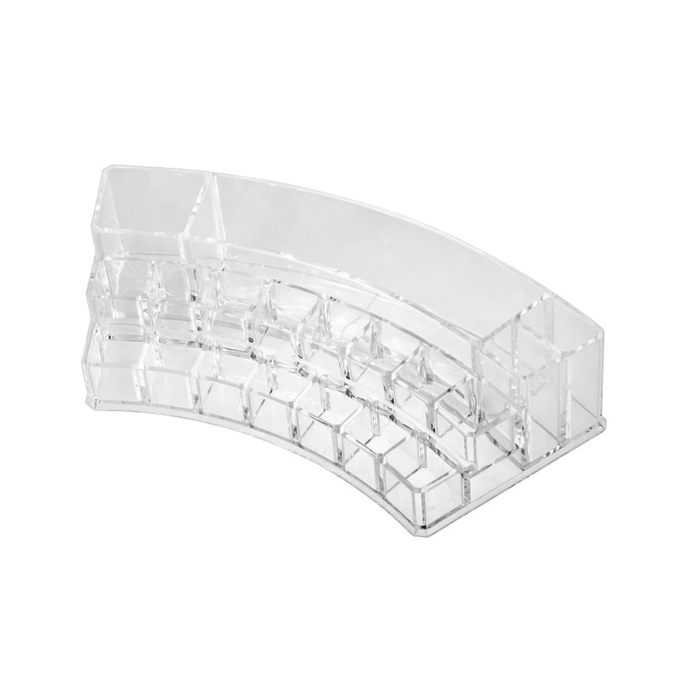 Органайзер для косметики размера, одноярусный с множеством отделений: 2 больших ячейки для кремов и туалетной воды, а мелкие для губной помады и маленьких бутылочек лака. Очень удобная в пользовании.