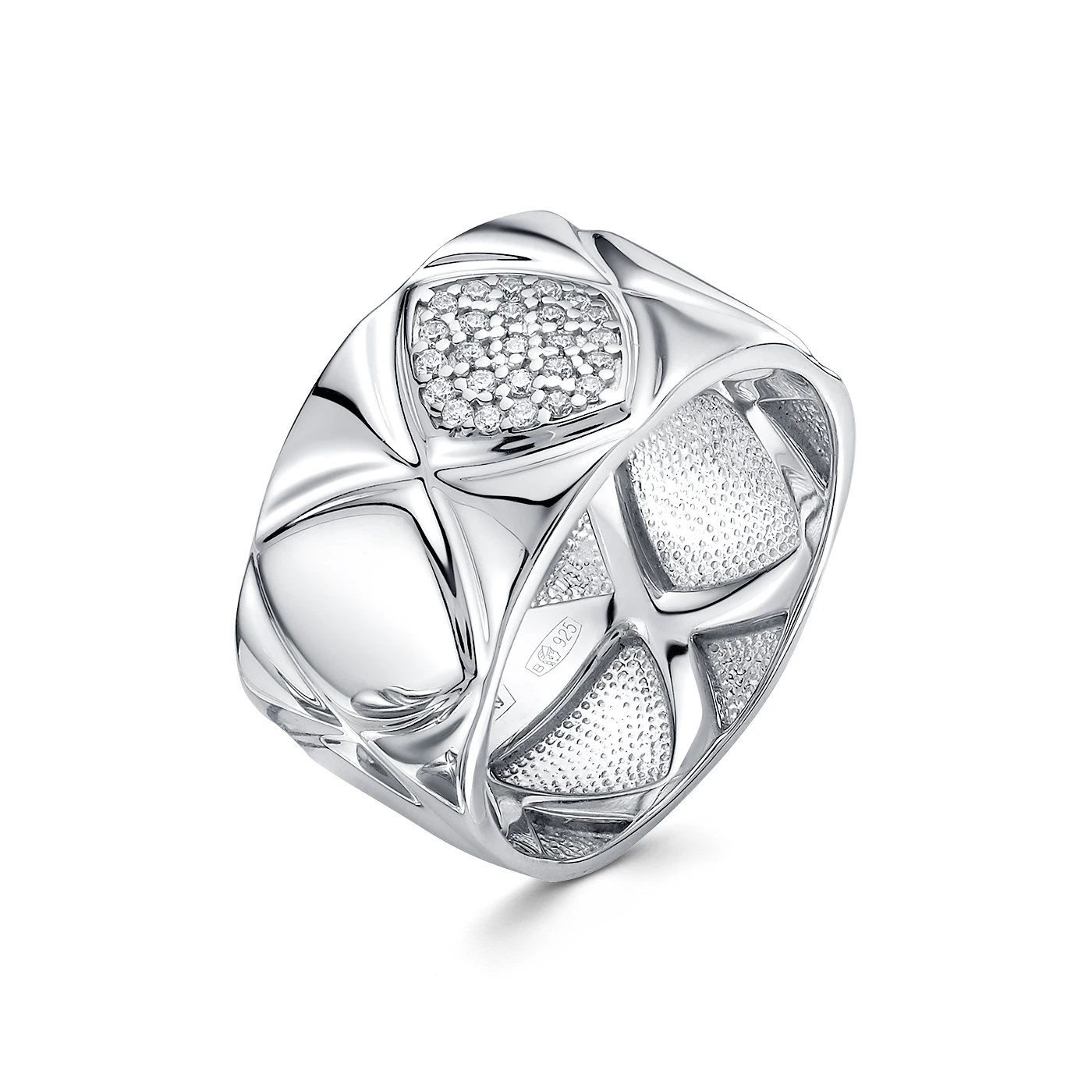 Объемное серебряное кольцо с симметричным рисунком в фианитовой обсыпке. Ширина изделия: 10,5 мм.