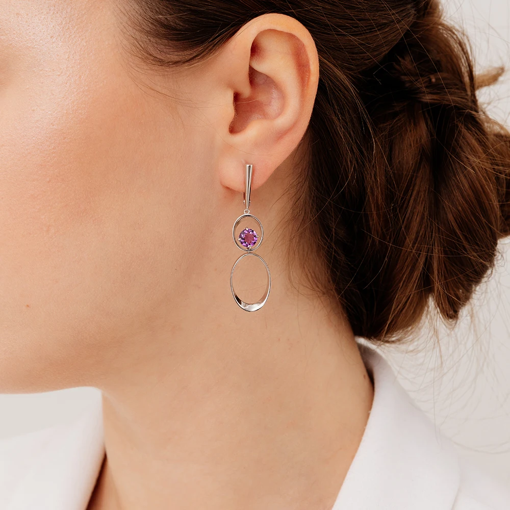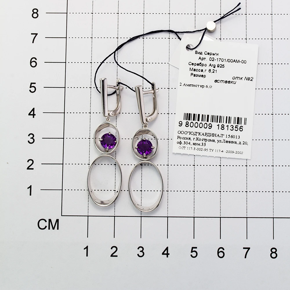 Длинные серьги 2021 тренд из родированного серебра 925 с полудрагоценными вставками (аметист)