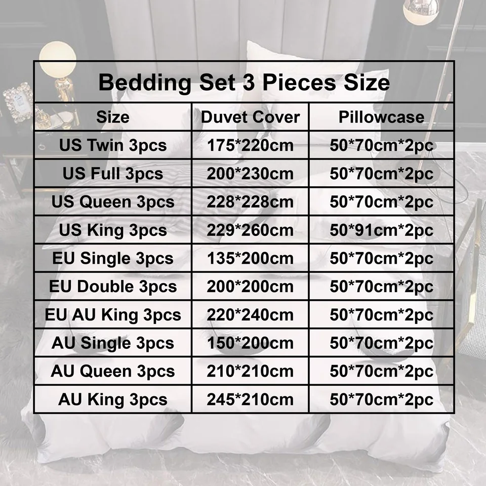 1 пододеяльник: 150*200 см = 59*79 дюймов 2 наволочки: 50*70 см = 20*28 дюймов