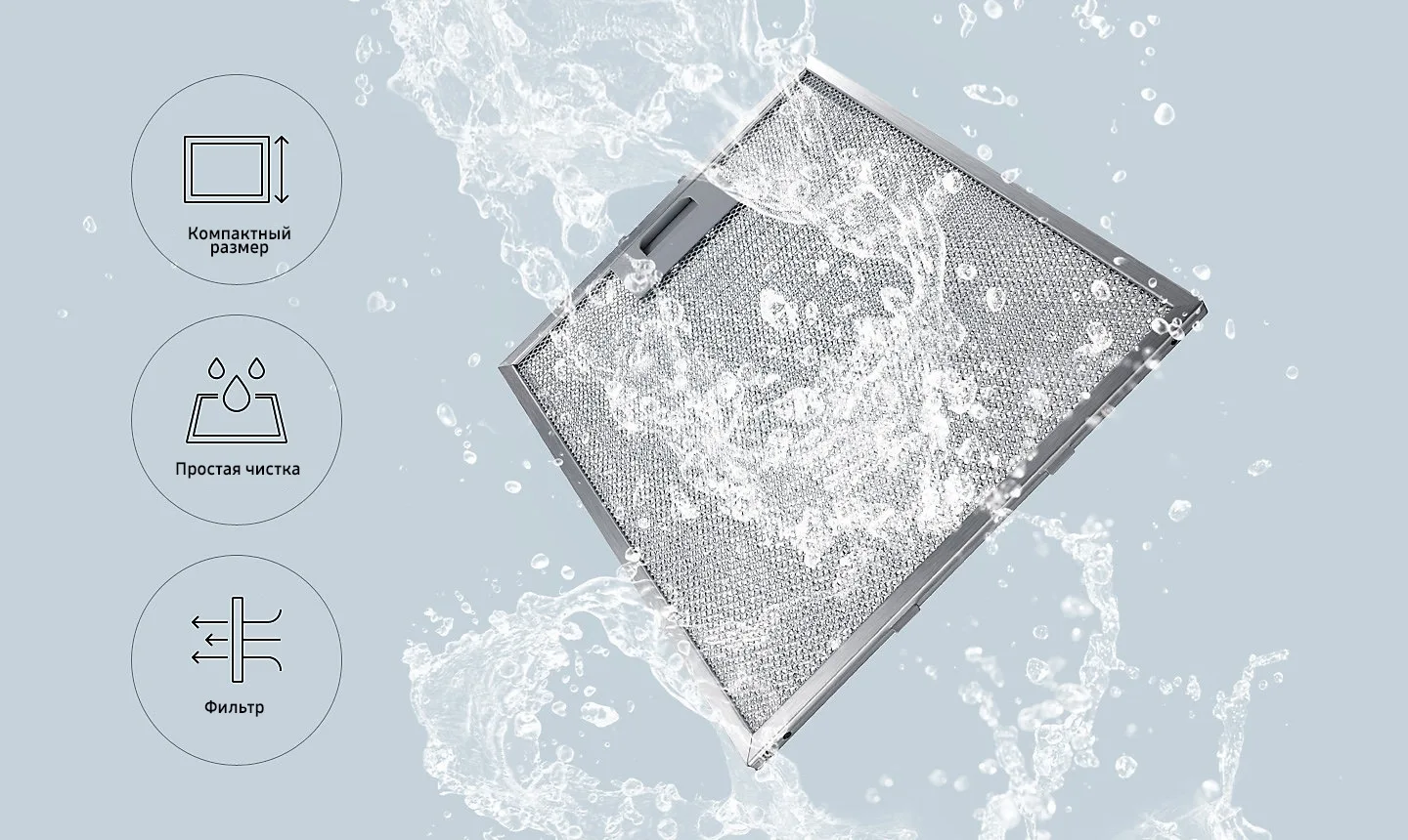 Долговечный и легкоочищаемый алюминиевый фильтр собирает пыль и испарения жира, предотвращая засорение мотора и лопастей вентилятора. Фильтр требует очистки всего раз в 3-4 недели, что очень просто, ведь фильтр с лёгкостью помещается в посудомоечную машину.