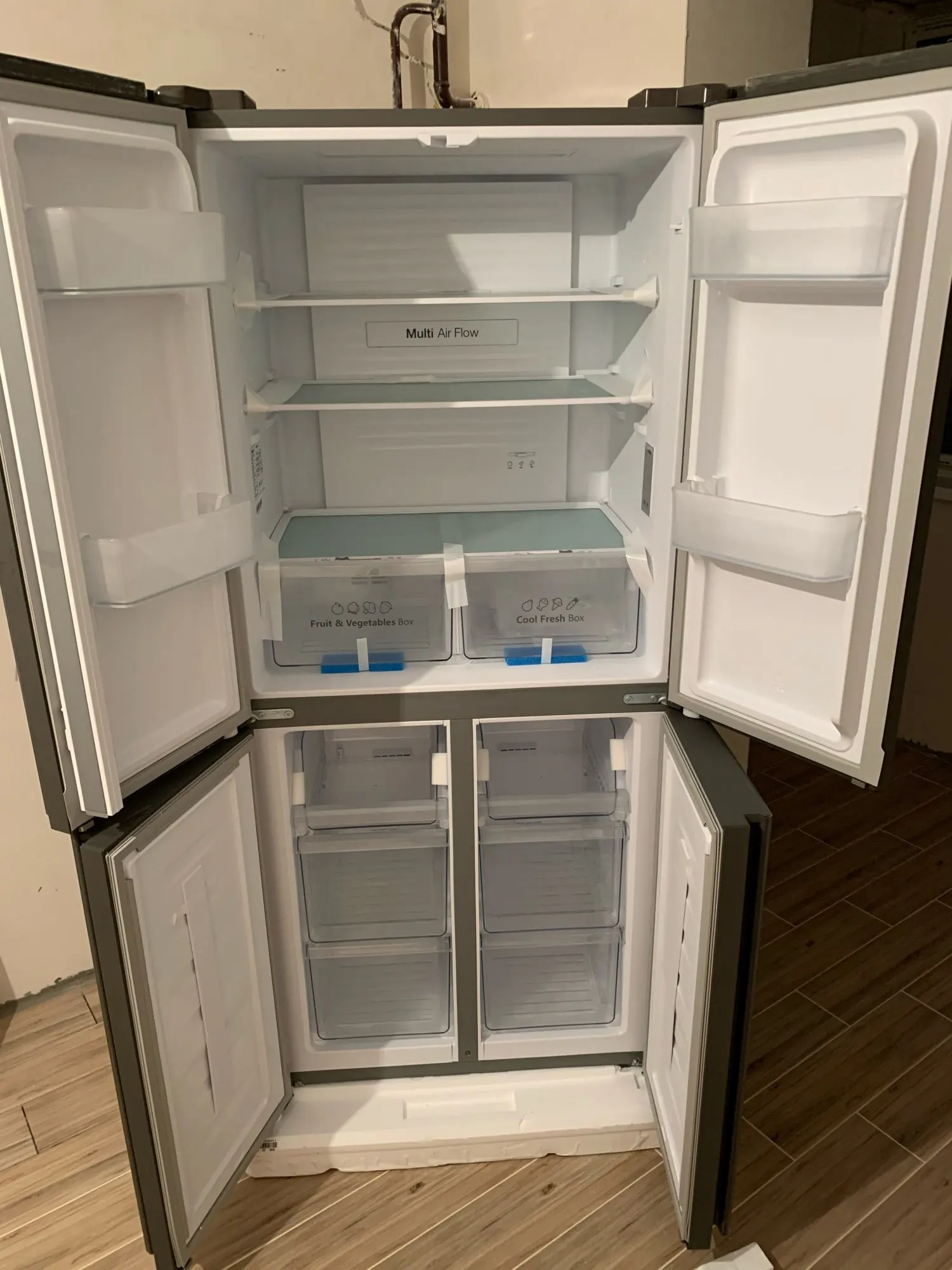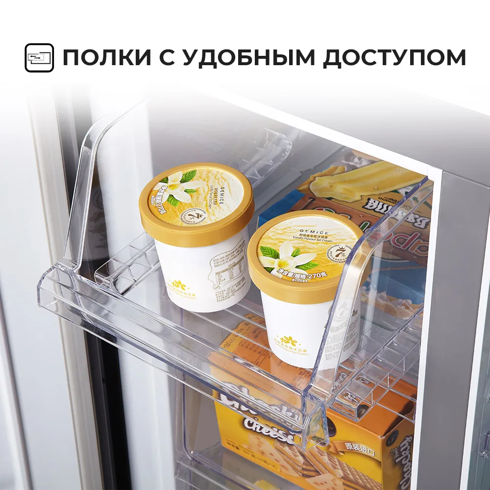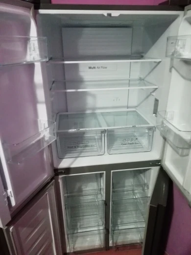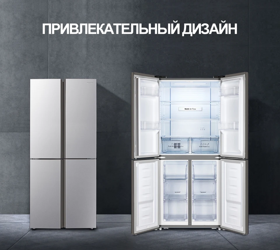 Купила на распродаже 11.11 в первую минуту, с моими купонами даже вышло дешевле, чем продавец обещал (39 тыс), но товар разобрали очень быстро,через час, а может и раньше, от начала распродажи уже не было в наличии. Доставка в Москву на третий день транспортной компанией: позвонили за час, сами подняли на этаж на грузовом лифте и в коридор квартиры занесли. После включения работал не бесшумно несколько часов, потом видимо вышел на свою температуру и стал работать практически бесшумно. Дизайн очень понравился, полки удобные и функциональные. Вместительный. Открывается самостоятельно любая из 4-х дверей. На колёсиках холодильник легко перемещается (можно пол под ним помыть),два передних фиксируются. Единственный найденный конструкторский недочёт: правый ящик для овощей не выдвигается при закрытой левой дверце. Нужно обе дверцы холодильниа открывать. Левый выдвигается при закрытой правой дверце, поэтому сделала его основным. При всех остальных плюсах этот недочёт можно потерпеть.