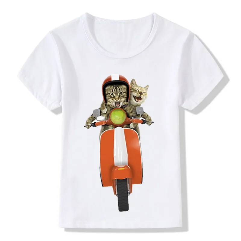 Забавная детская футболка с 3D рисунком кошки езды на мотоцикле, детская повседневная одежда для мальчиков и девочек, летние модные топы, футболка
