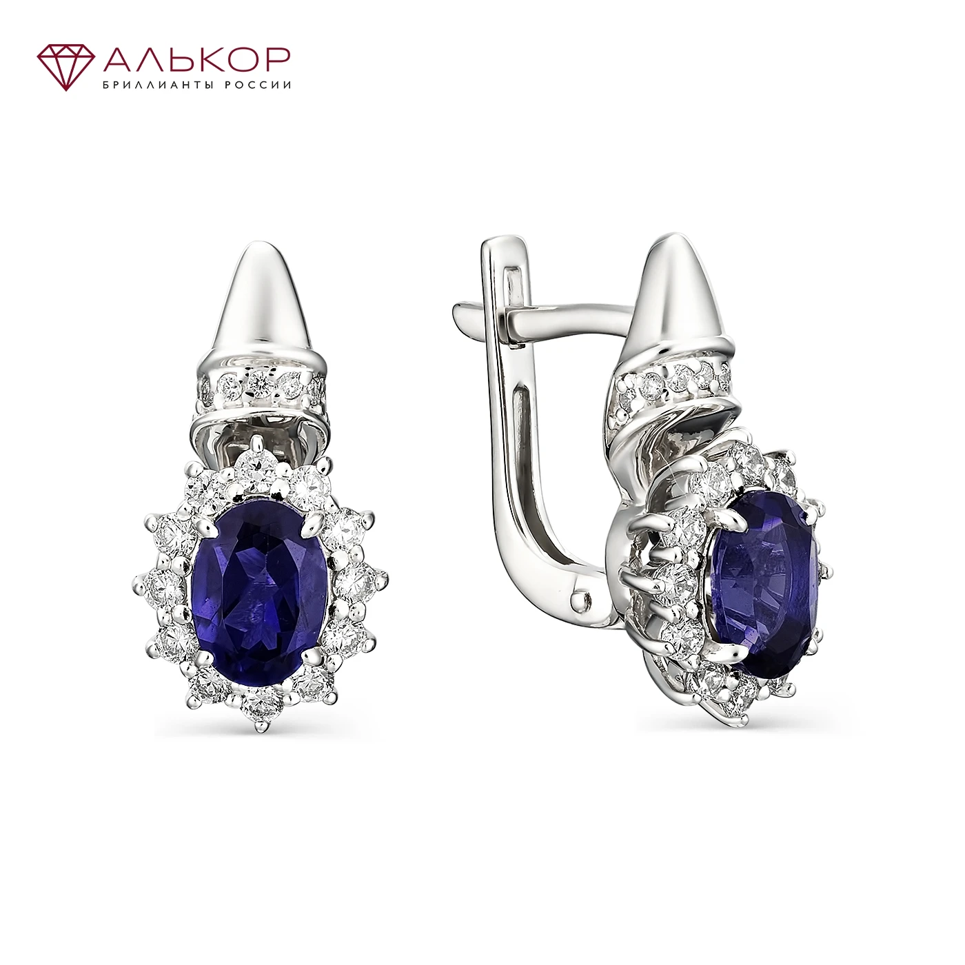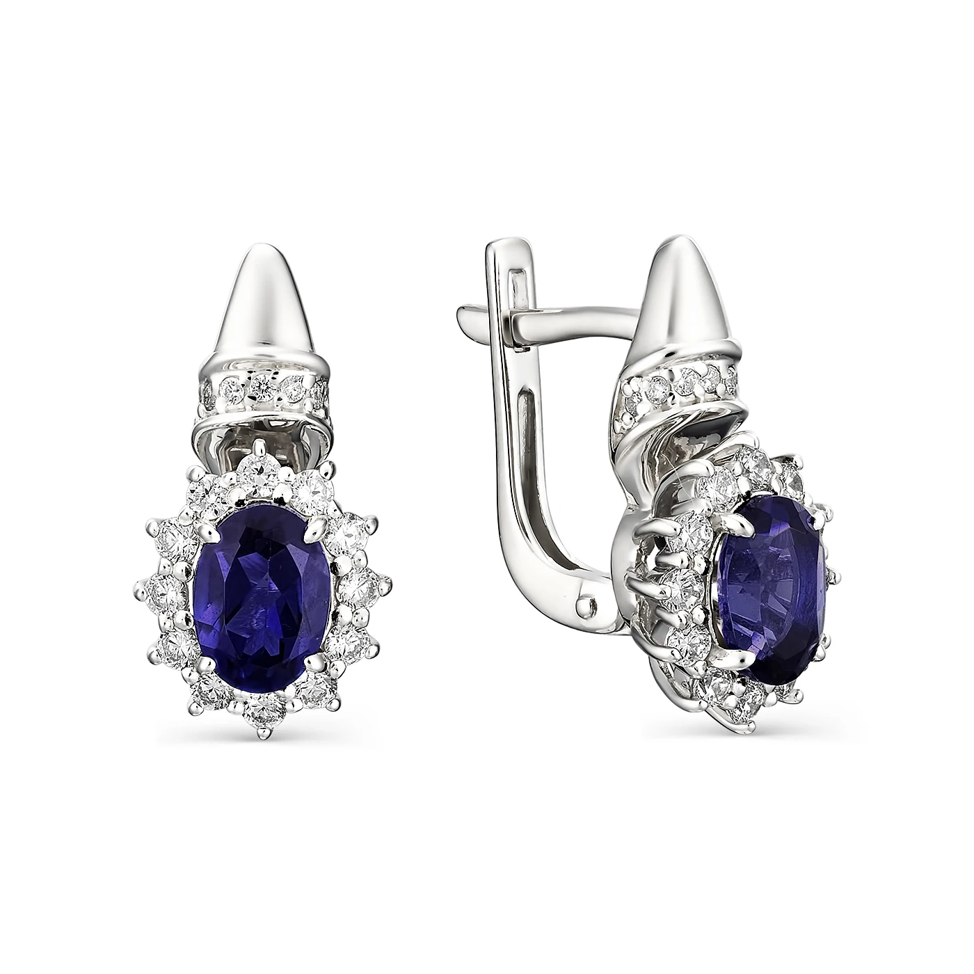 Серьги на английском замке из серебра с гидротермальным сапфиром глубокого синего оттенка и фианитовой обсыпкой. Высота изделия: 19 мм. Ширина изделия: 10 мм.
