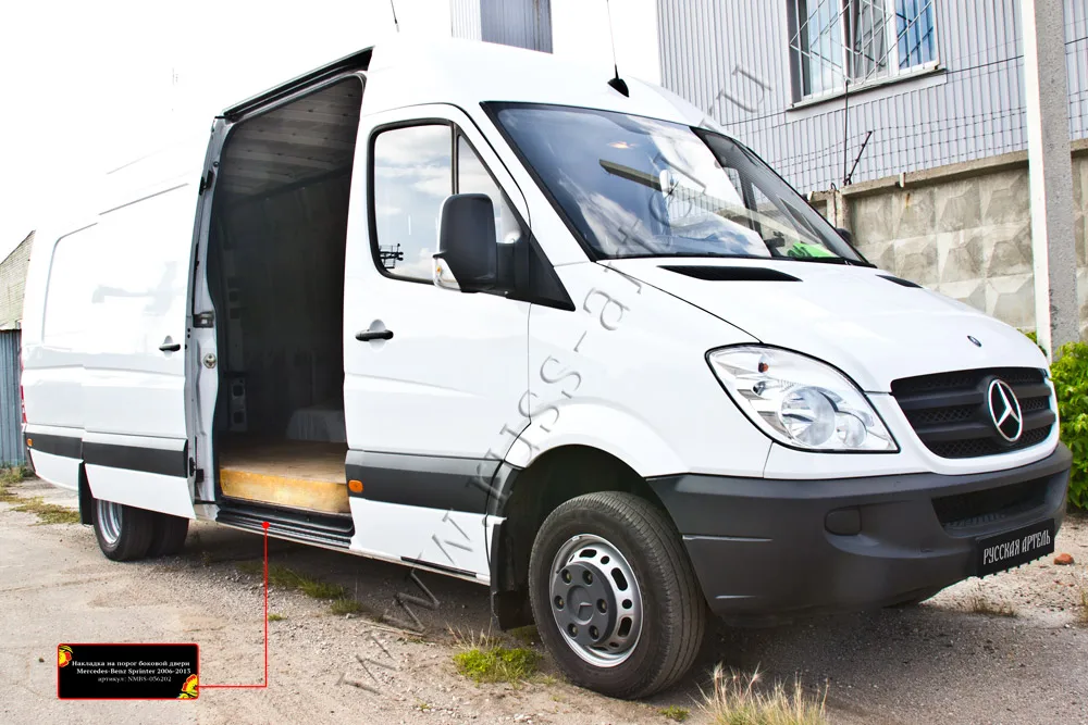 Так почему бы не наделить свой коммерческий транспорт отличным и проверенным средством защиты? «Русская Артель» предлагает вам изделие собственного производства. Это накладка на порог боковой двери для Мерседес Бенц Спринтер, начиная с 2006 по 2013 годы выпуска.