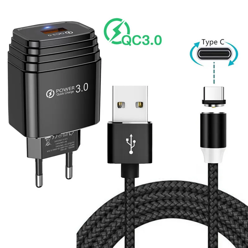 Быстрое зарядное устройство USB для Samsung S20, A20, 18 Вт, QC 3,0, адаптер для телефона Xiaomi Redmi 9, Honor 8, HTC, ZTE, LG, Магнитный зарядный кабель Type-C