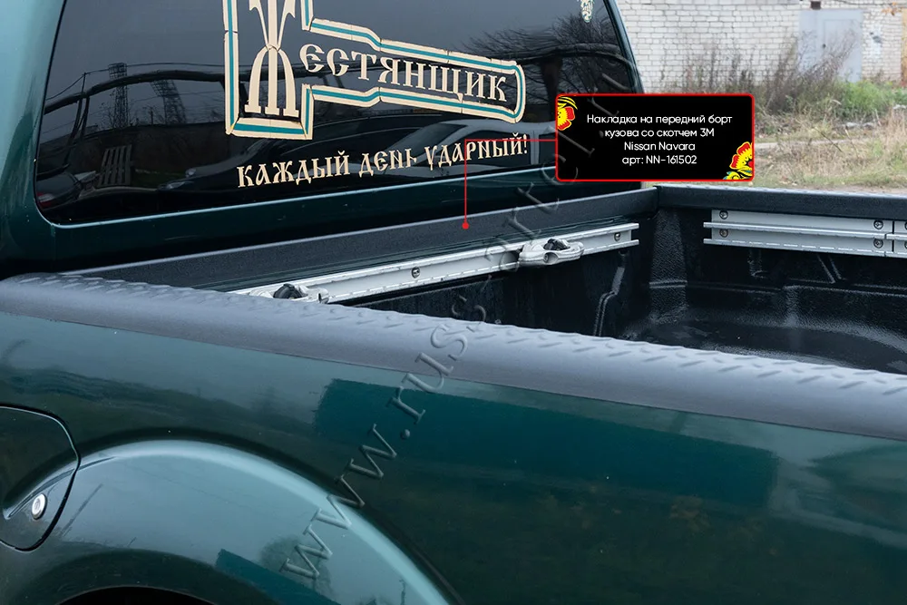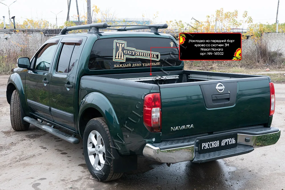 Накладка защищает борт грузового отсека от механических и природных повреждений, а также от коррозии. Накладка на борт выпускается компанией "Русская Артель" в двух вариантах: с двухсторонним скотчем марки "3М" и бюджетный вариант без скотча. Подходят на автомобиль Nissan Navara 2005-2015.
