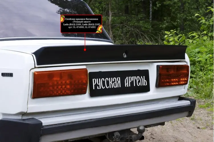 Спойлер крышки багажника "Утиный хвост" Duck Tail подходит на автомобили ВАЗ 2105, ВАЗ 2107. В комплект поставки входит сам спойлер, без крепежных элементов.Данный спойлер может быть установлен на крышку багажника различными способами: на двусторонний скотч, на герметик, на клепки, на болтовые соединения.Спойлер крышки багажника "Утиный хвост" производства компании "Русская Артель" позволяет сохранить штатный замок багажника.