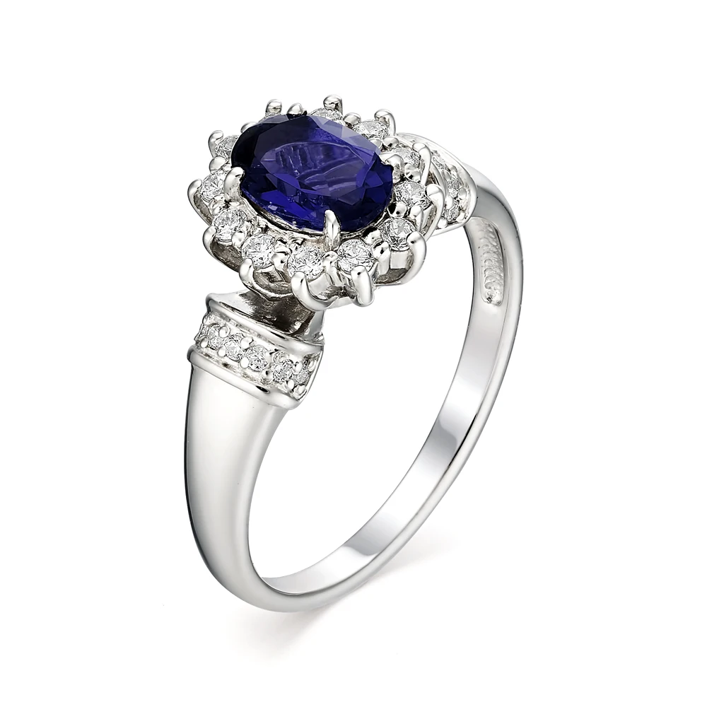 Кольцо из серебра с гидротермальным сапфиром глубокого синего оттенка и фианитовой обсыпкой.