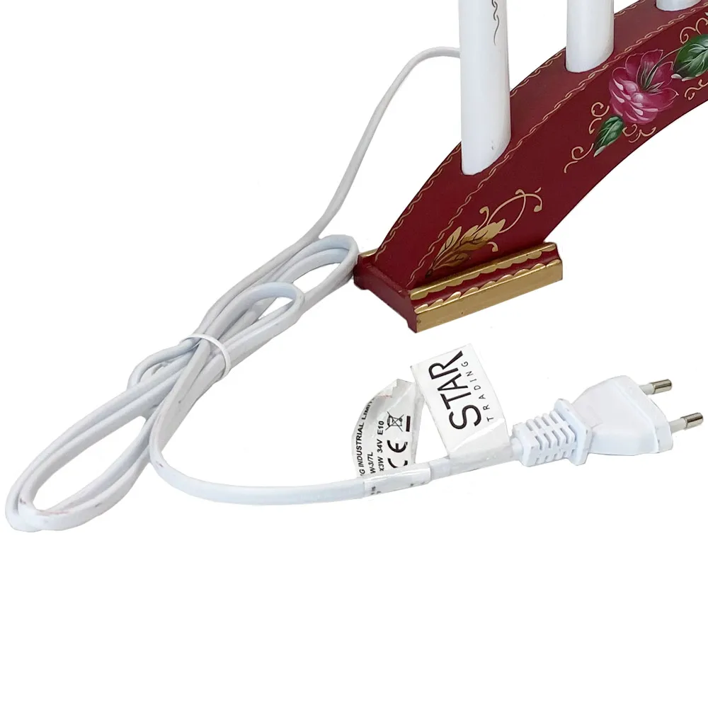 Светильник горка рождественская «Ада» служит в качестве украшения подоконника к новому году, а также используется как декор для интерьера. Светильник горка красиво будет смотреться на каминной полке, комоде, журнальном столике и так далее. Изделие изготовлено из натурального дерева (цвет покрытия бордо), подставка под электро-свечи украшена искусственными хвойными веточками. Форма корпуса треугольная. Горка расписана вручную в стиле Жостово. Новогодняя горка оснащена белым кабелем питания длиной 1,8 м с переключателем. Лампочки (3W,34V), патрон E10. Работает от электросети макс. 230V.