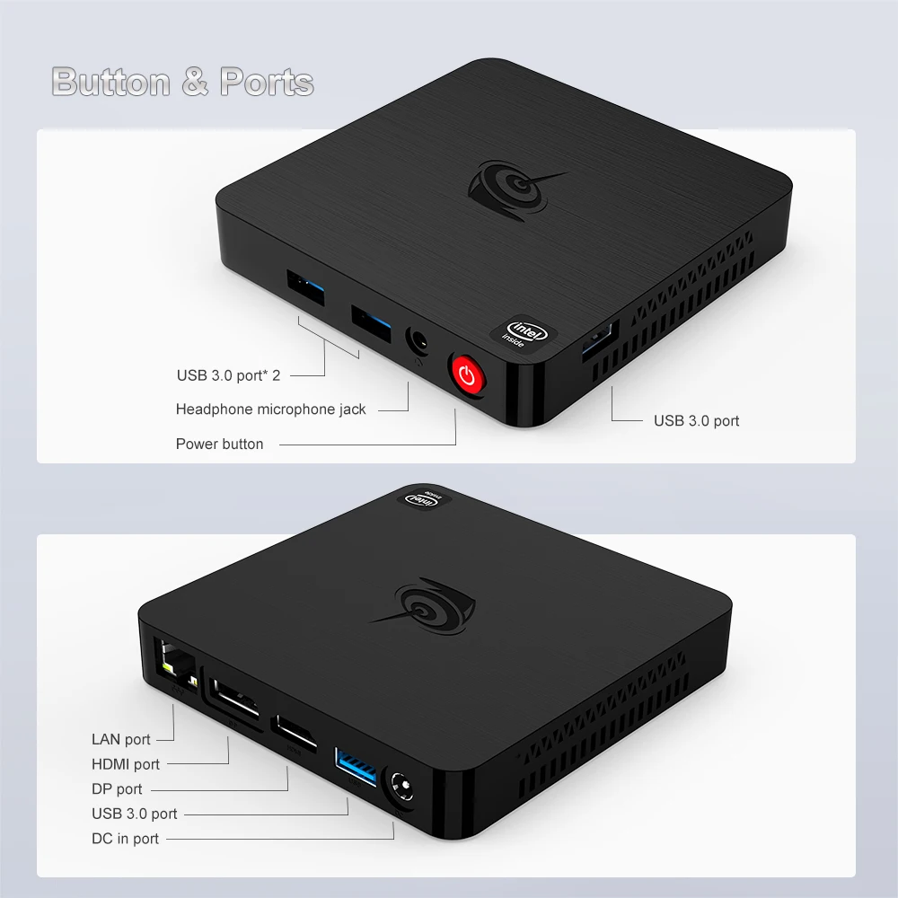 Четырехъядерный процессор Intel Atom Z8500 (2 Мб кэш-памяти, до 2,24 ГГц) Intel HD Graphics 4 ГБ LPDDR3 + 64 Гб ROM Лицензированная windows 10 4 x USB 3,0 Двухдиапазонный Wifi Bluetooth 4,0 1 x RJ45 1000 Мбит/с LAN HD-MI + DP 4K HTPC