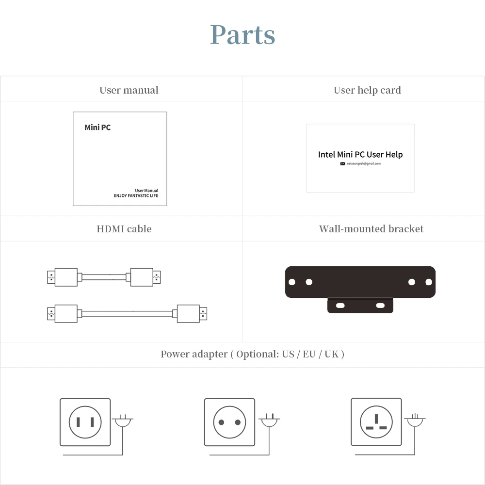 1 мини-ПК, 1 х адаптер питания, 2 x HD-MI кабель, 1 x Руководство пользователя 1 x вспомогательная карта пользователя 1 х настенный кронштейн