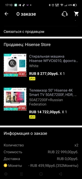 Второй заказ комплекта: телевизор плюс стиралка получен и проверен. От заказы остались только положительные эмоции. Продавец магазин Hisense- молодец ! Почаще проводите такие акции.Сегодня увидел в магазине с 21 января опять будет проводиться акция в комплекте дешевле. Буду признателен за оценку моего отзыва.