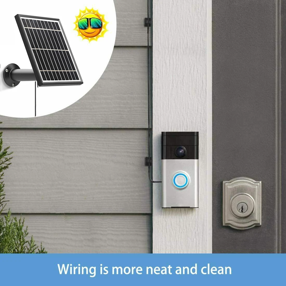 Простая установка: Просто прикрепите панель солнечных батарей или вне вашего дома облицовочная под прямым воздействием солнечных лучей, не, вы можете подключить его к кольцу видео-дверной звонок через на заказ FPC разъем. Настраиваемый металлический шнур питания FPC позволяет установить дверной звонок на стене.