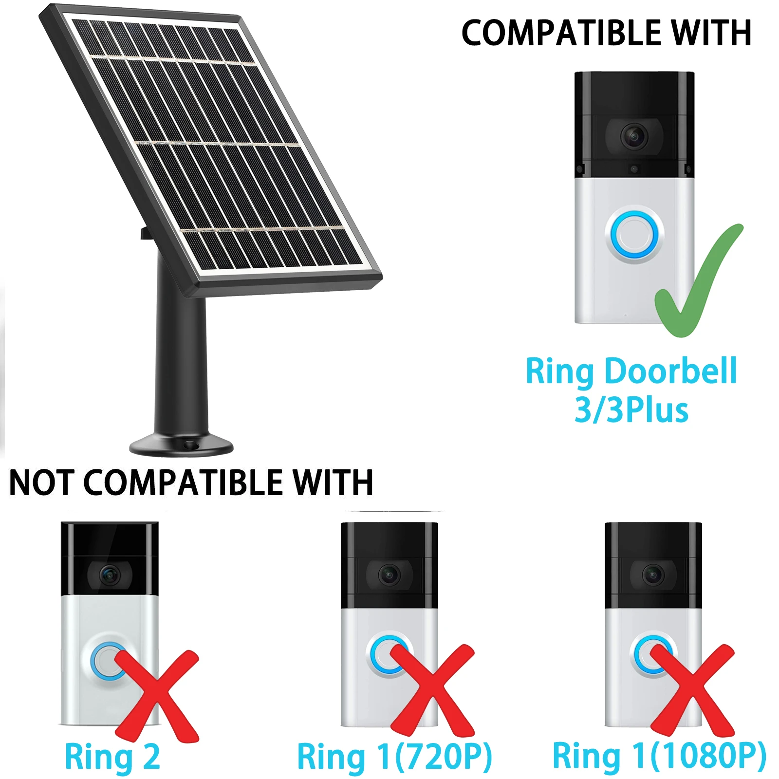 Упаковочный лист: 1 кисть для маскирующих средств панели солнечных батарей, 1 х 360 ° надежное крепление кронштейн, 1 х 4,9 м/16.1ft кабель, 3 x винты; Обратите внимание: Этот продукт не является кольцо продукта, указанный выше бренд и модель предназначены только для демонстрации совместимости; Если дверной звонок не работает нормально, Отсоедините разъем micro USB от дверного звонка, дайте солнечной панели работать на солнце более 4 часов, а затем вставьте разъем micro USB в камеру и проверьте ситуацию.