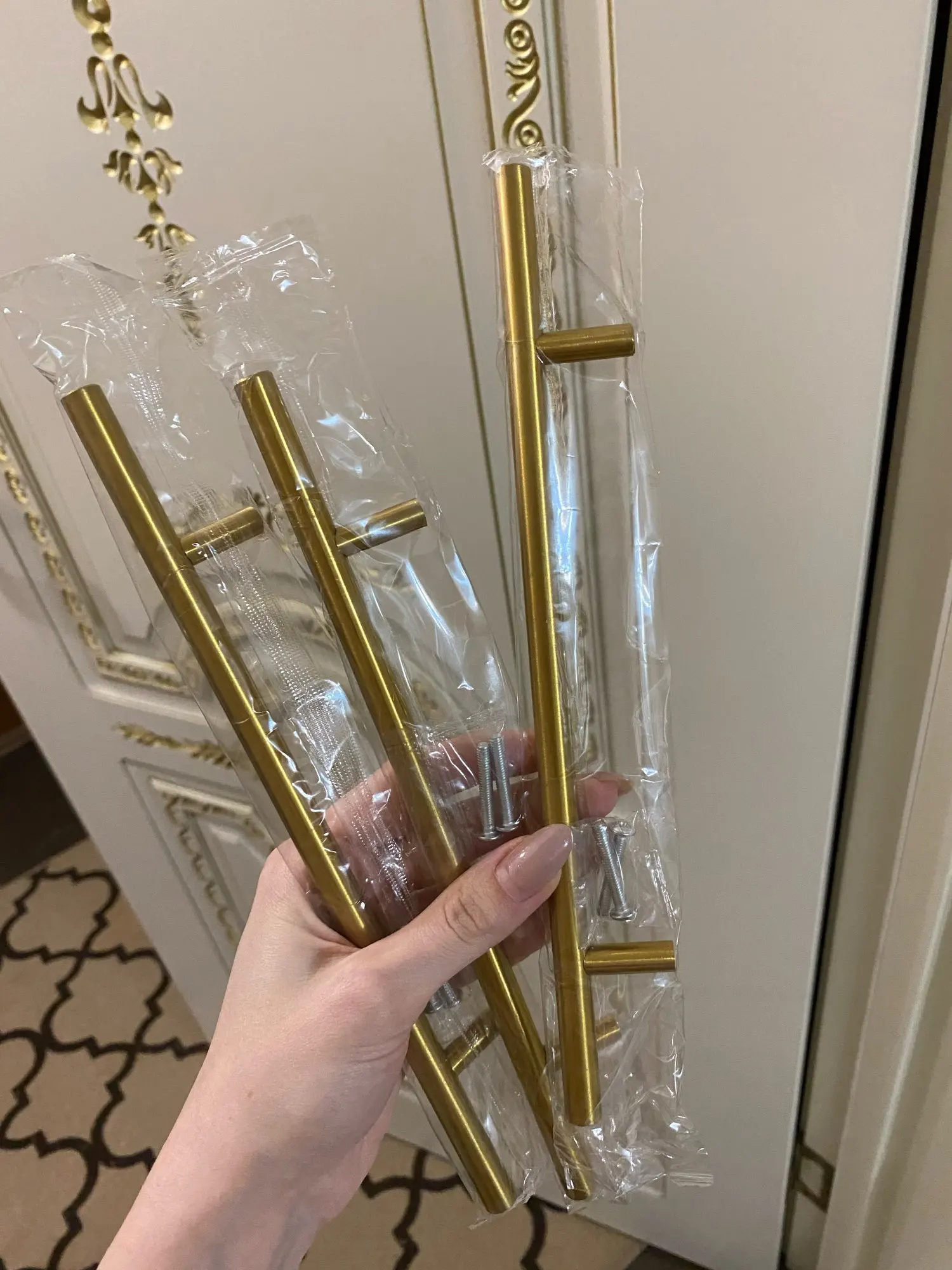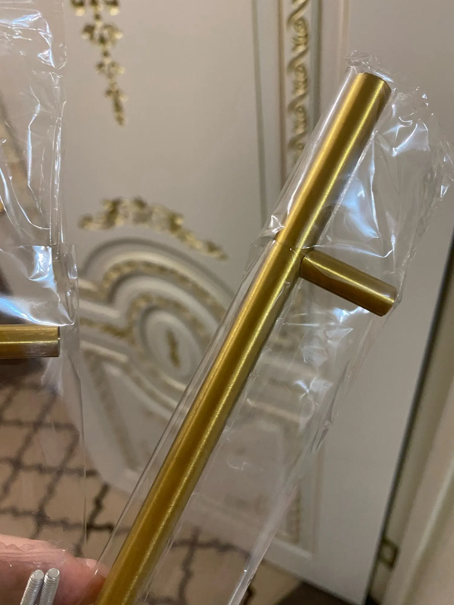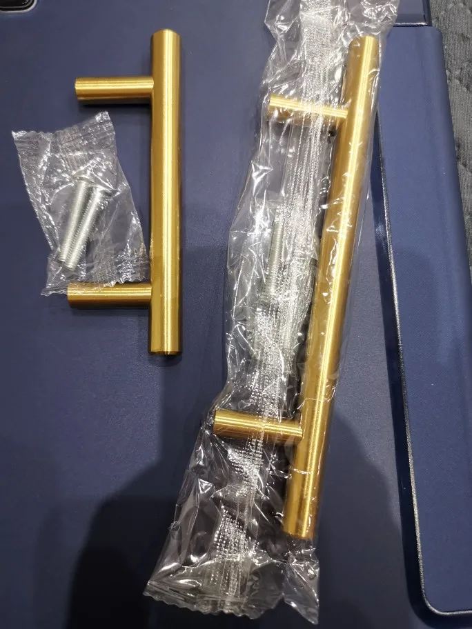 Ручки красивого золотого цвета. Доставка в Краснодарский край около двух недель. Понравились. Хорошо подходят к кухне. Надеюсь краска не слезет)