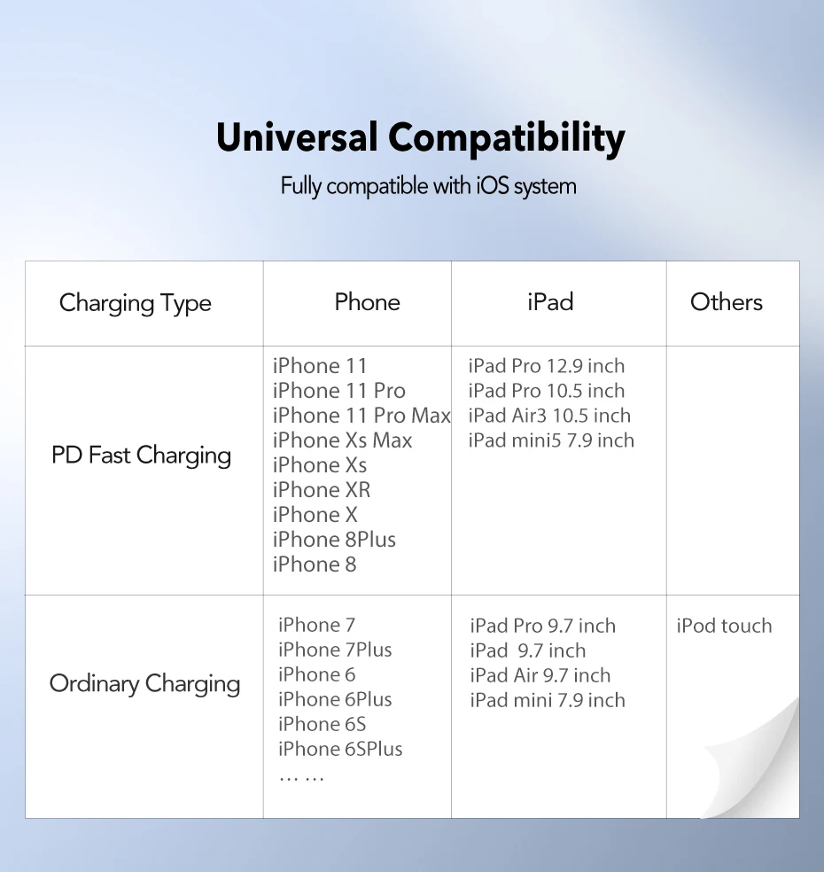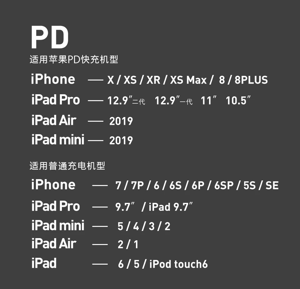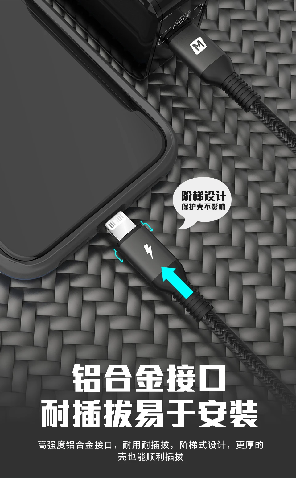 1. Кабель для передачи данных Bonjour PD Apple, кабель с быстрой зарядкой Поддержка всей системы iOS 2. Реальная Быстрая зарядка PD с 50% за 30 минут Используйте адаптер PD 18 Вт или выше, вы можете полностью зарядить 50% аккумулятора за 30 минут. 3. Официальная оригинальная головка Apple MFi не всплывает Оригинальный чип и 8-pin C94 терминал головка автоматически очищает синхронизироваться с системой iOS, и окно не будет pop up во время зарядки и передачи данных на большие расстояния. Нейлоновая оплетка, прочный кевлар USB кабель с нейлоновой оплеткой внешний стеганое покрывало DuPont кевлар пуленепробиваемый волокна обертывания ядро, светильник вес и сильный, непрерывная тяговым усилием. 4. Интерфейс из алюминиевого сплава, устойчив к подключению и прост в установке Высокопрочный интерфейс из алюминиевого сплава, прочный и долговечный, ступенчатый дизайн, более толстый корпус может быть плавно вставлен и удален. 5. Резьбовой Соединитель с фиксированной линией, устойчивый к изгибу и не легко сломать Резьбовые впрыски-формованные усиленные соединители вставляются и вытягиваются, не опасаясь повреждения соединителя грубым изгибом, и более долговечны, не ломаясь. 6. Независимо от положительного и отрицательного, оба конца поддерживают слепую вязку Нет никакой разницы между двумя портами, который может быть заряжен Слепые и закупоривания, таким образом, это не так легко беспокоиться о повреждении интерфейс устройства.
