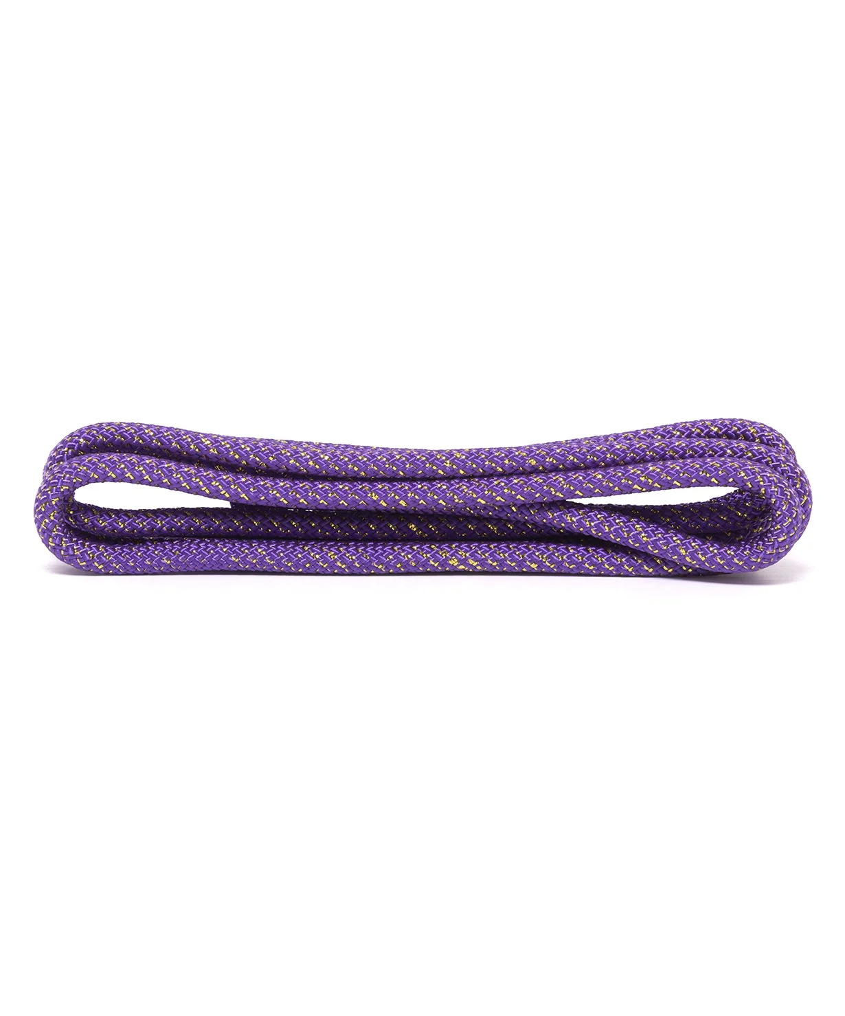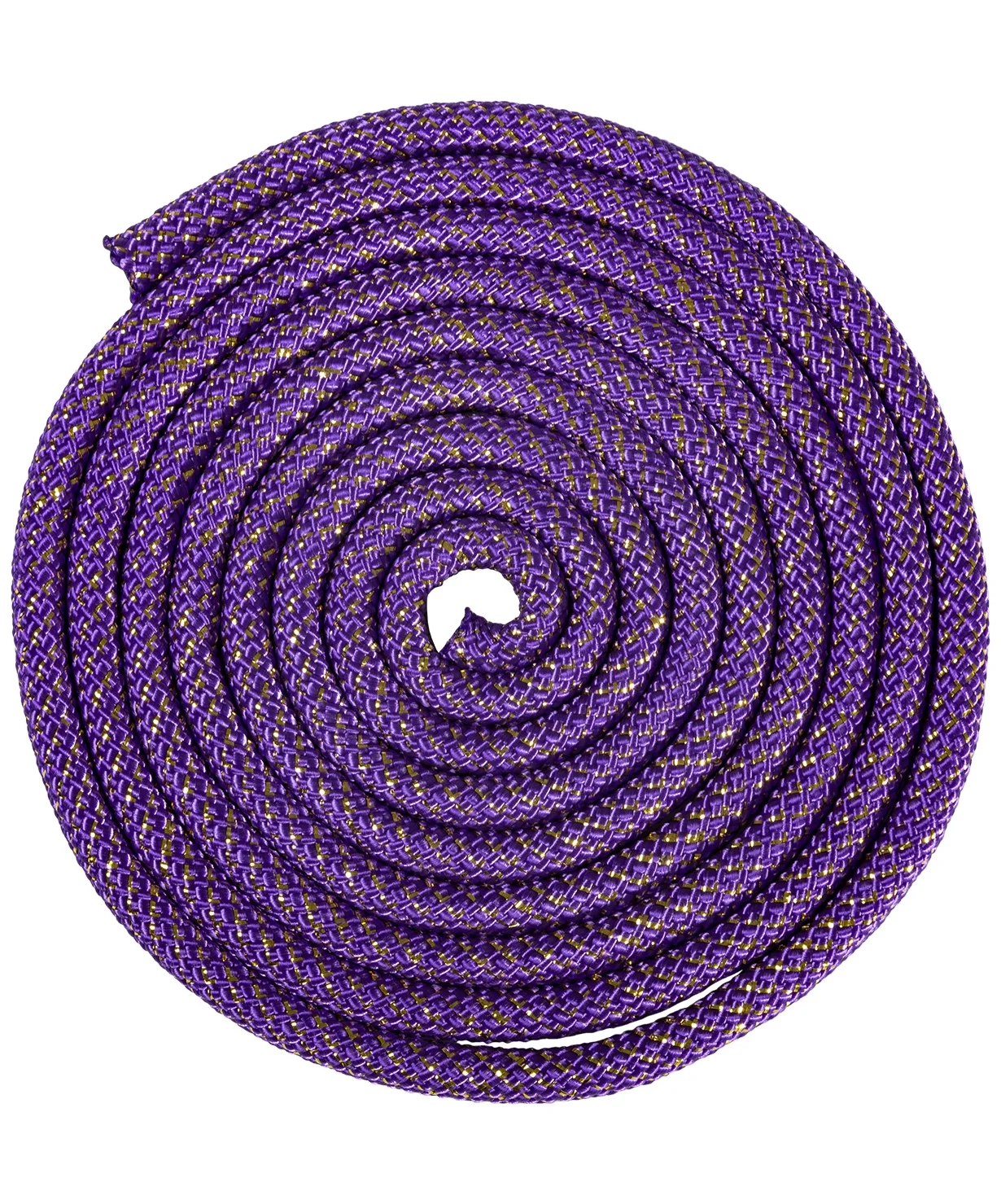 Скакалка для художественной гимнастики RGJ-403 изготовлена из качественного синтетического материала полиамида, очень прочная, износостойкая. Сохраняет эластичность и форму. В скакалку вплетена тонкая металлическая нить - люрекс, благодаря ей скакалка красиво блестит. Скакалка - один из предметов для занятий и выступлений в художественной гимнастике. Внешне она похожа на обычную веревку, не имеет ручек, как у обычной скакалки – правилами разрешается только завязывать узел или прижигать края. Длина скакалки регулируется и должна быть пропорциональна росту гимнастки.Характеристики:Длина, м: 3Материал: полиамидКоличество прядей, шт: 40Диаметр сечения, мм: 10Цвет: фиолетовый/золотой