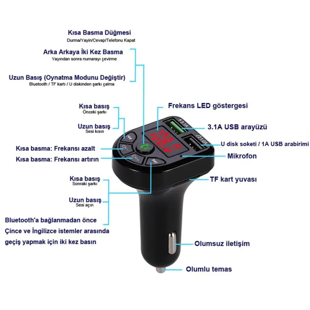 2 USB порта автомобильное зарядное устройство-2 порта USB (5V-2.4A и 5V-1A) вместе с, можно заряжать 2 устройства одновременно. Музыкальный значок есть через usb-порт, usb-диск yalnыzca через дополнение к прослушиванию музыки с вашего устройства может заряжать кого-то.