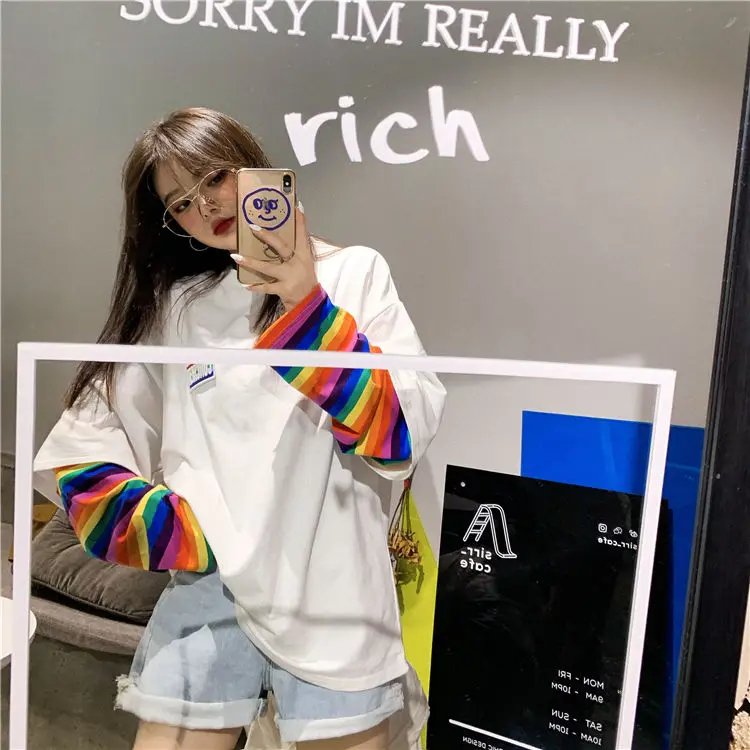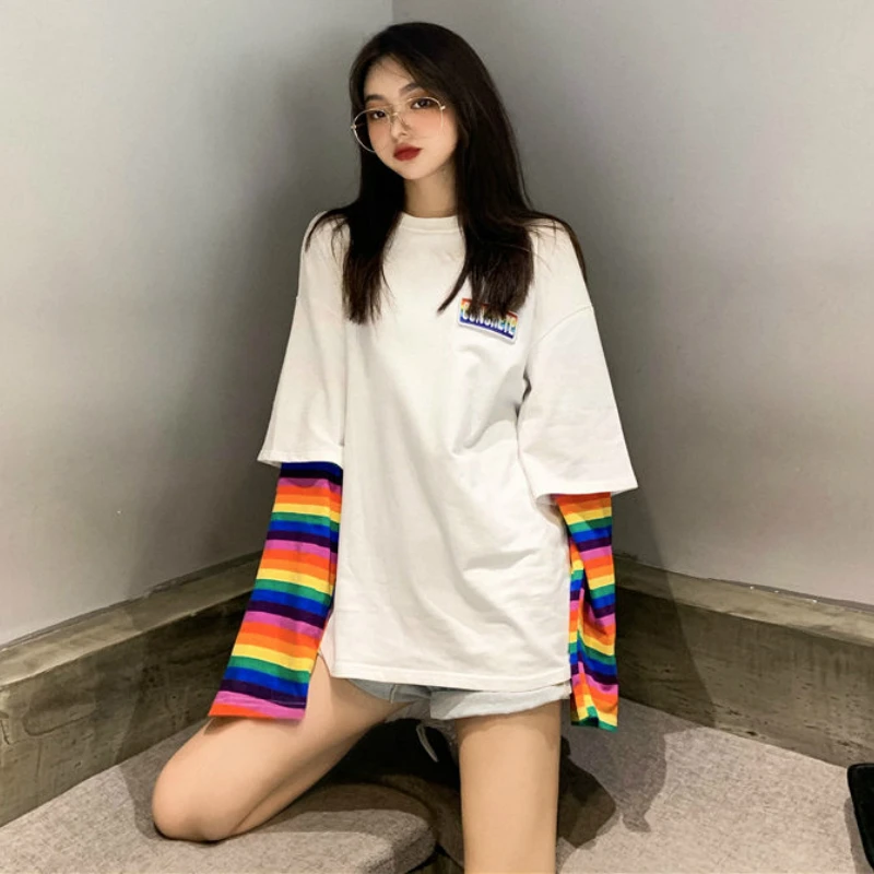 Женские толстовки Ulzzang с имитацией двух предметов, милые радужны...