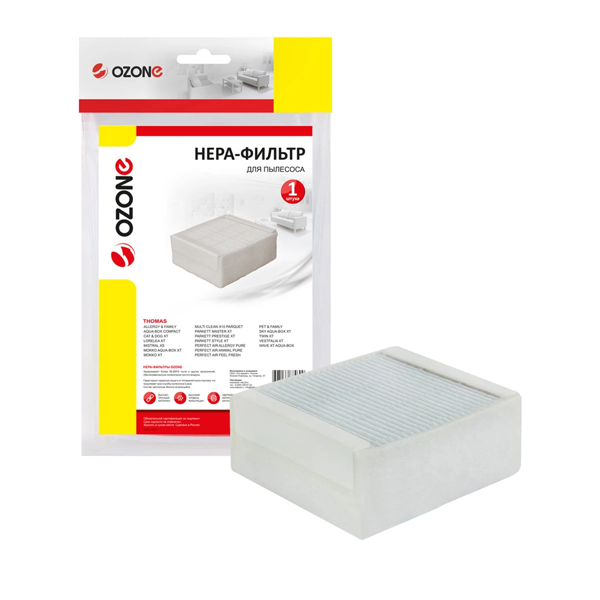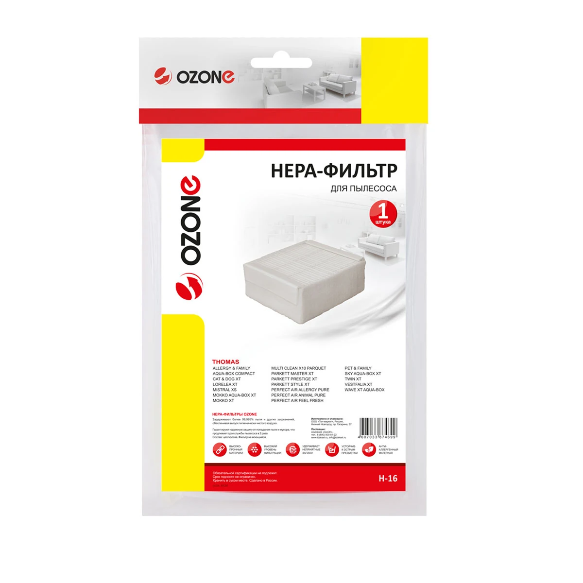 HEPA фильтр для пылесоса THOMAS серии TWIN XT/XS, 1 шт., многоразовый моющийся, бренд: OZONE, арт. H-16