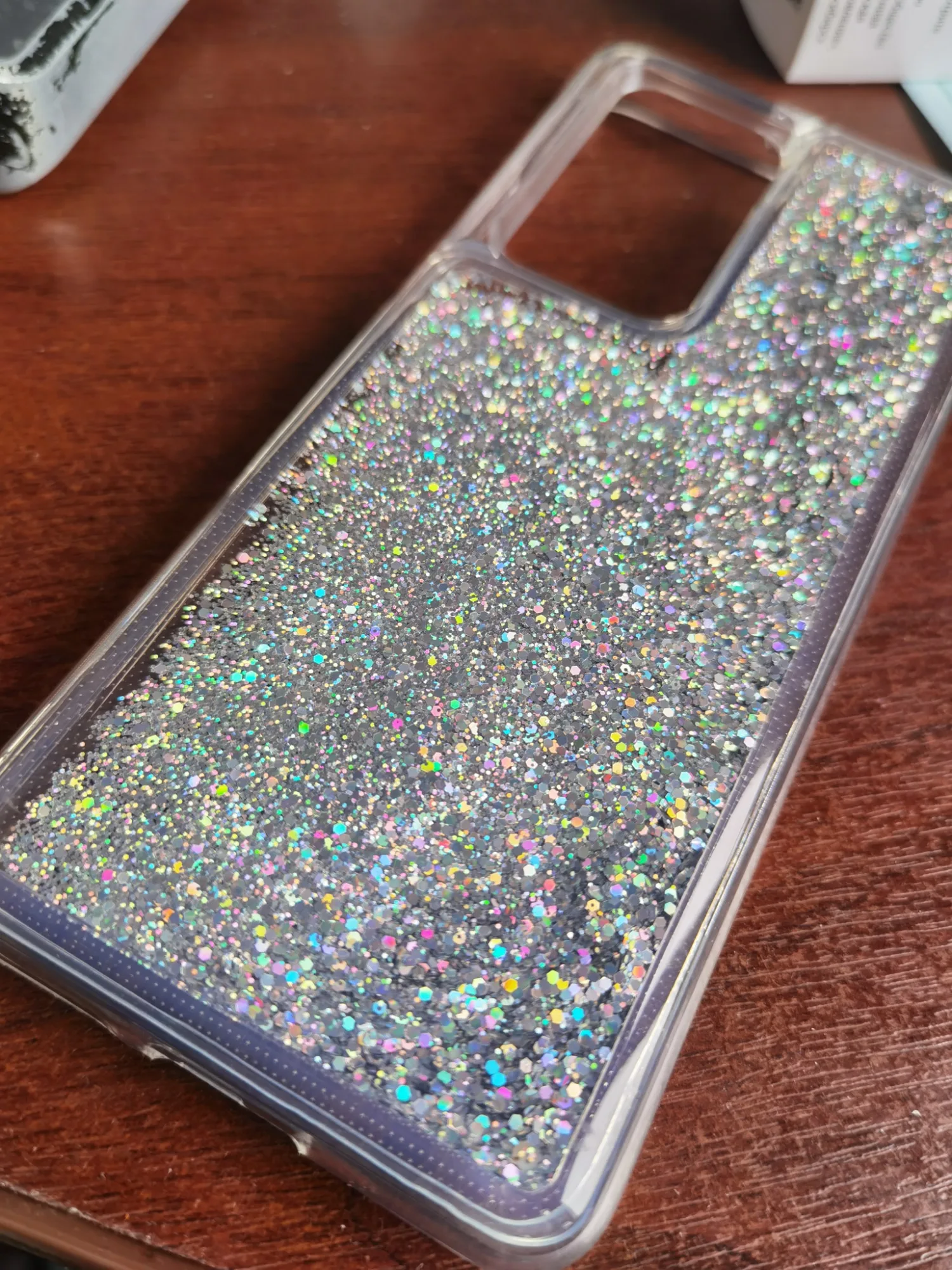 Чехол просто супер! Очень аккуратный. Подошёл идеально. Всё переливается, блестки разного размера. Я в восторге! Давно такой искала, без рисунка - только блёстки!!! Доставка ОЧЕНЬ быстрая!