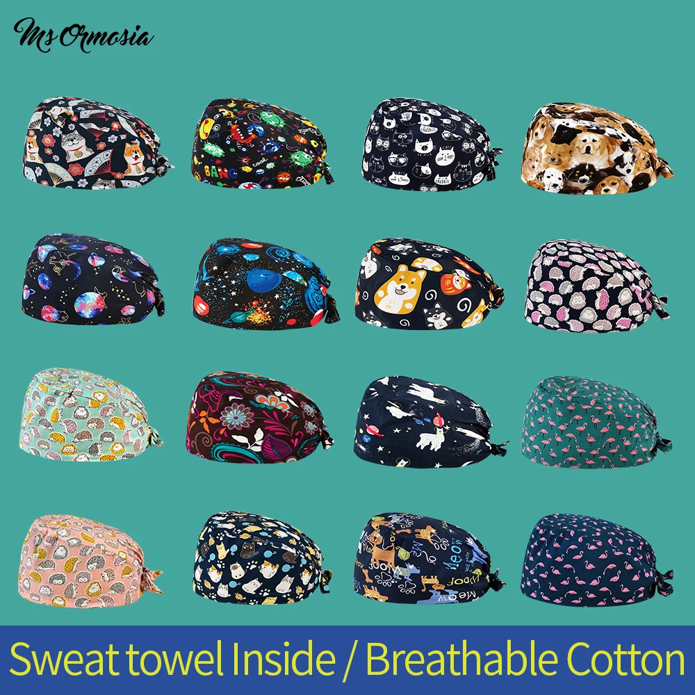 Дышащий чистый хлопок, для мужчин и женщин, с мультяшным принтом, эластичный, для ухода за домашними животными, скраб, шапки для спа-лаборатории, для работы, скраб, Кепка с логотипом на заказ