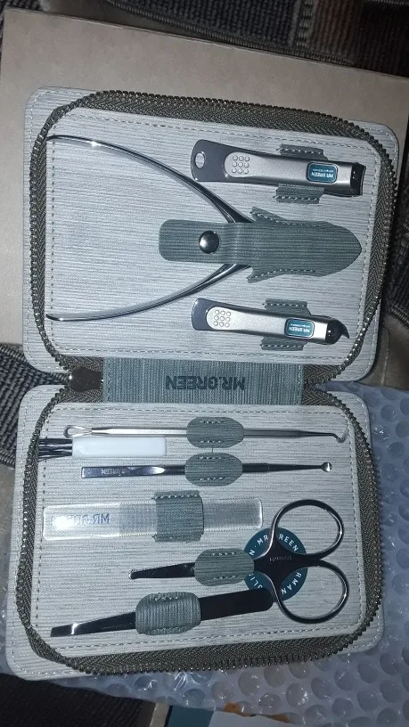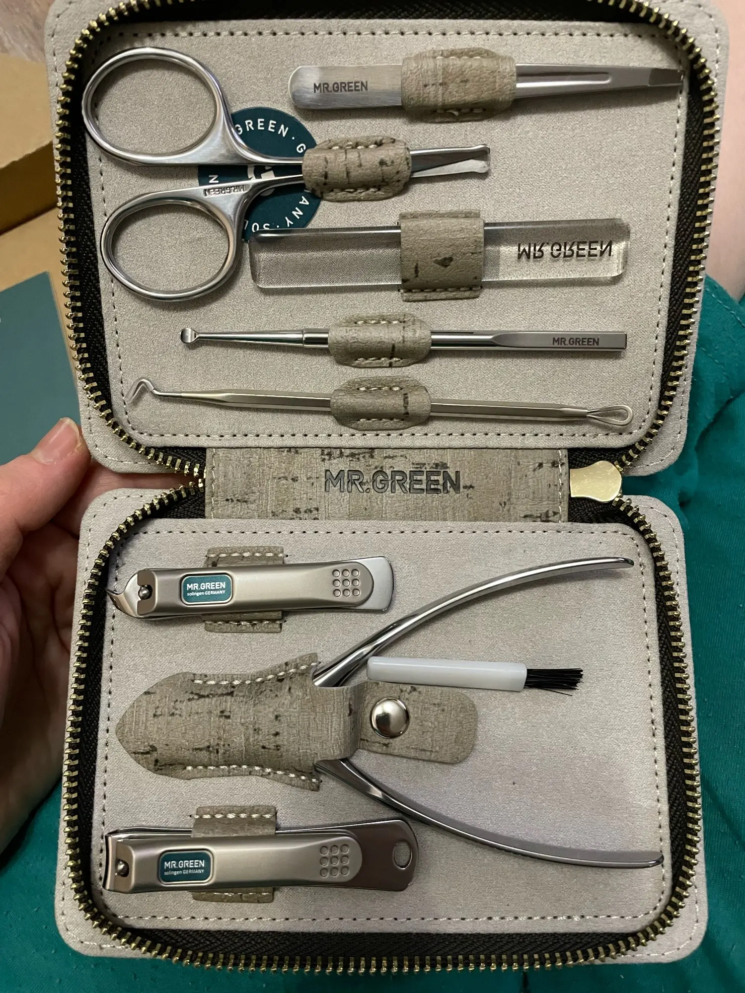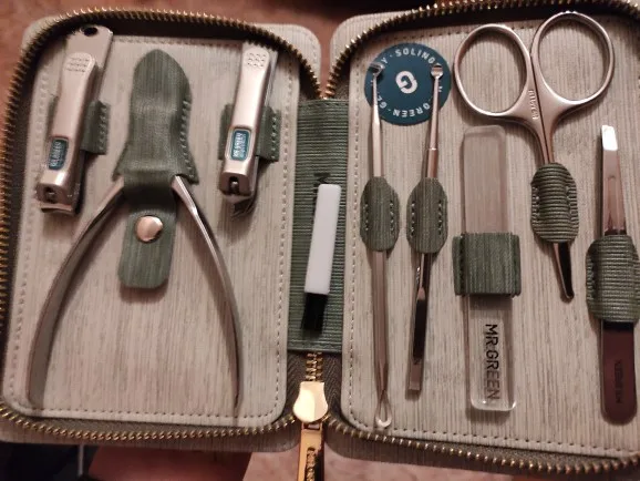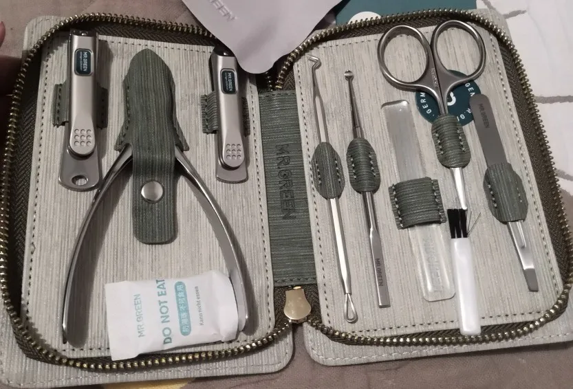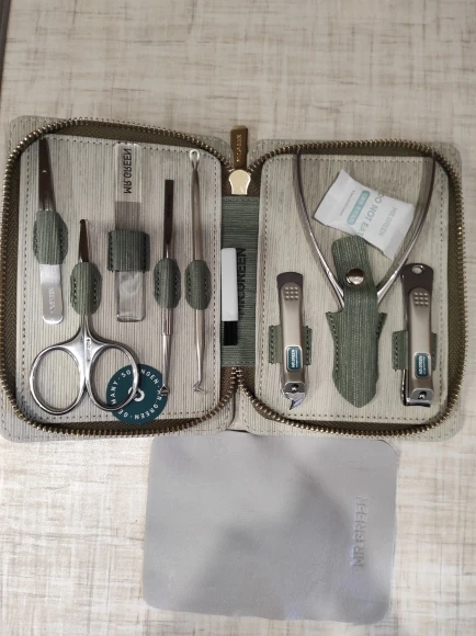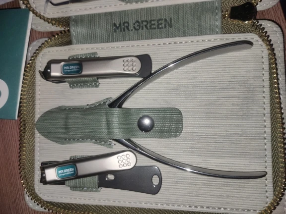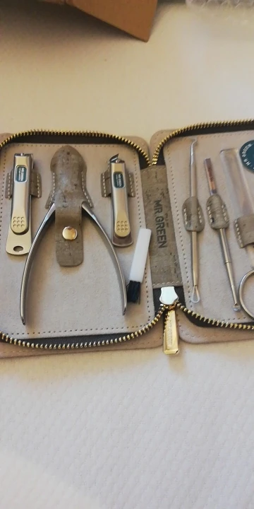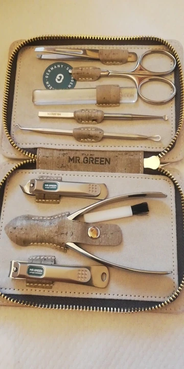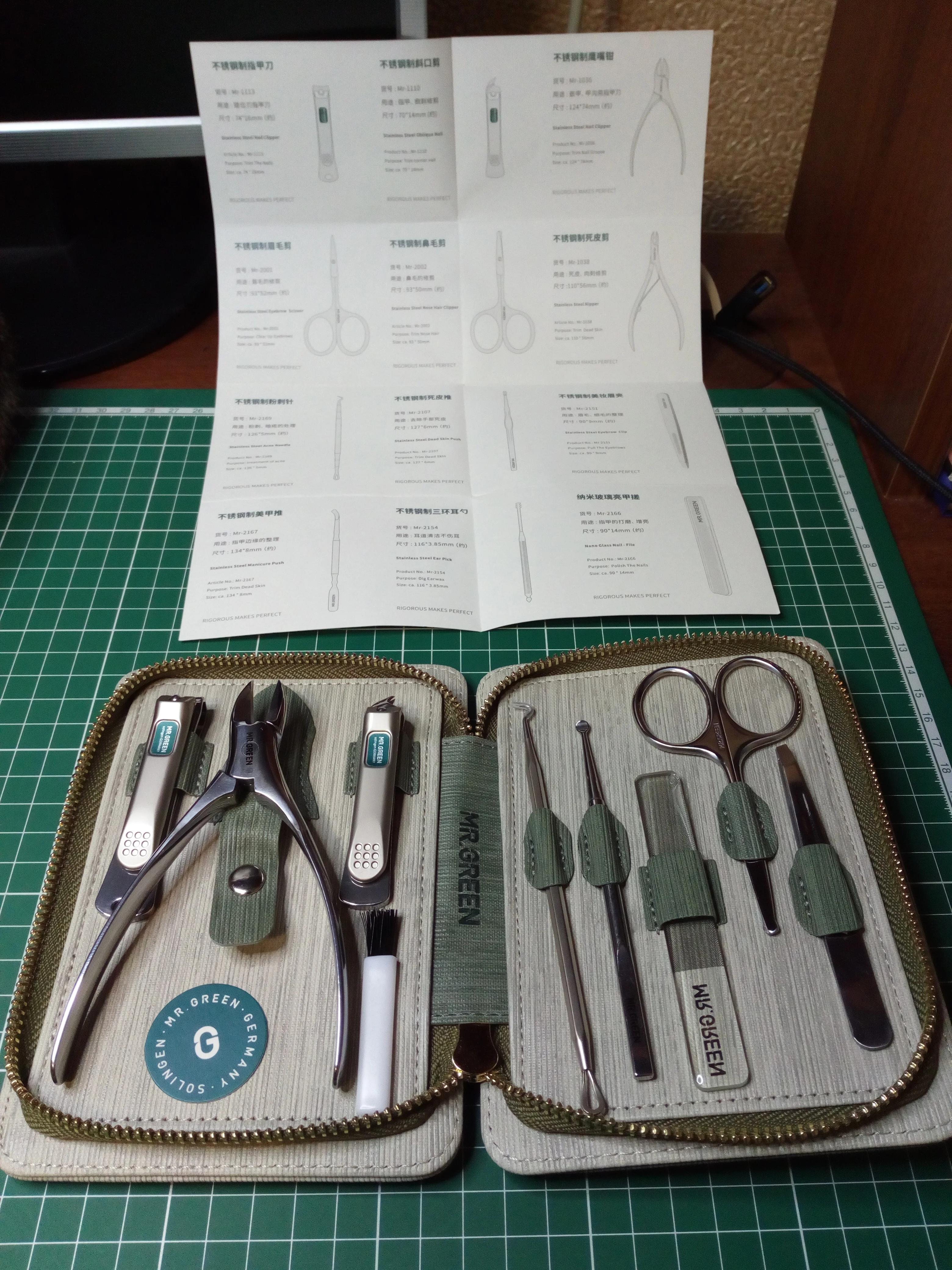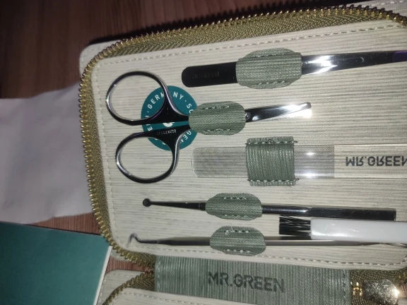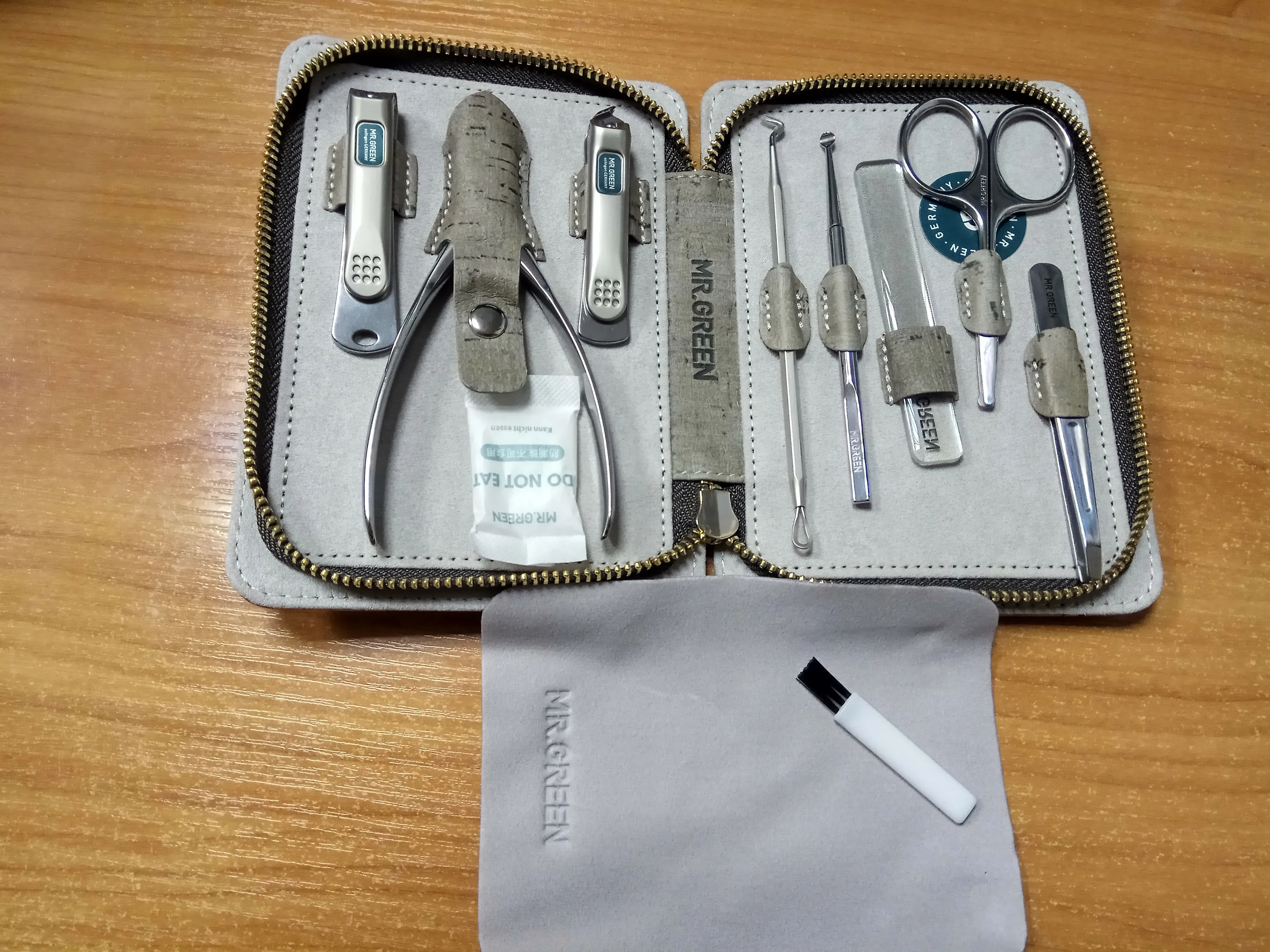 Великолепное качество маникюрного набора! Острая заточка кусачек, качественная стеклянная пилочка. У кусачек внутри тоже есть пилочки. В наборе есть ещё два инструмента для косметических процедур. У ножниц скруглённые концы, это безопасней, чем острые. Все инструменты выполнены на отлично, приятно держать в руках. Набор можно брать в подарок, качественный красивый футляр, фирменная упаковка. Прилагается вкладыш с обзором инструментов Mr.Green. Упаковано было очень хорошо, пузырчатая плёнка и транспортная коробка. Набор покупался на распродаже 11.11, было много заказов поэтому отправка задержалась, на всё ушло 7 дней.