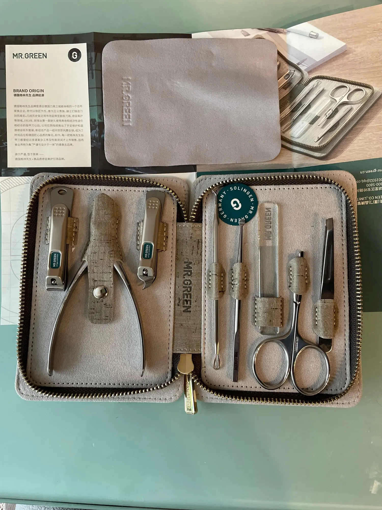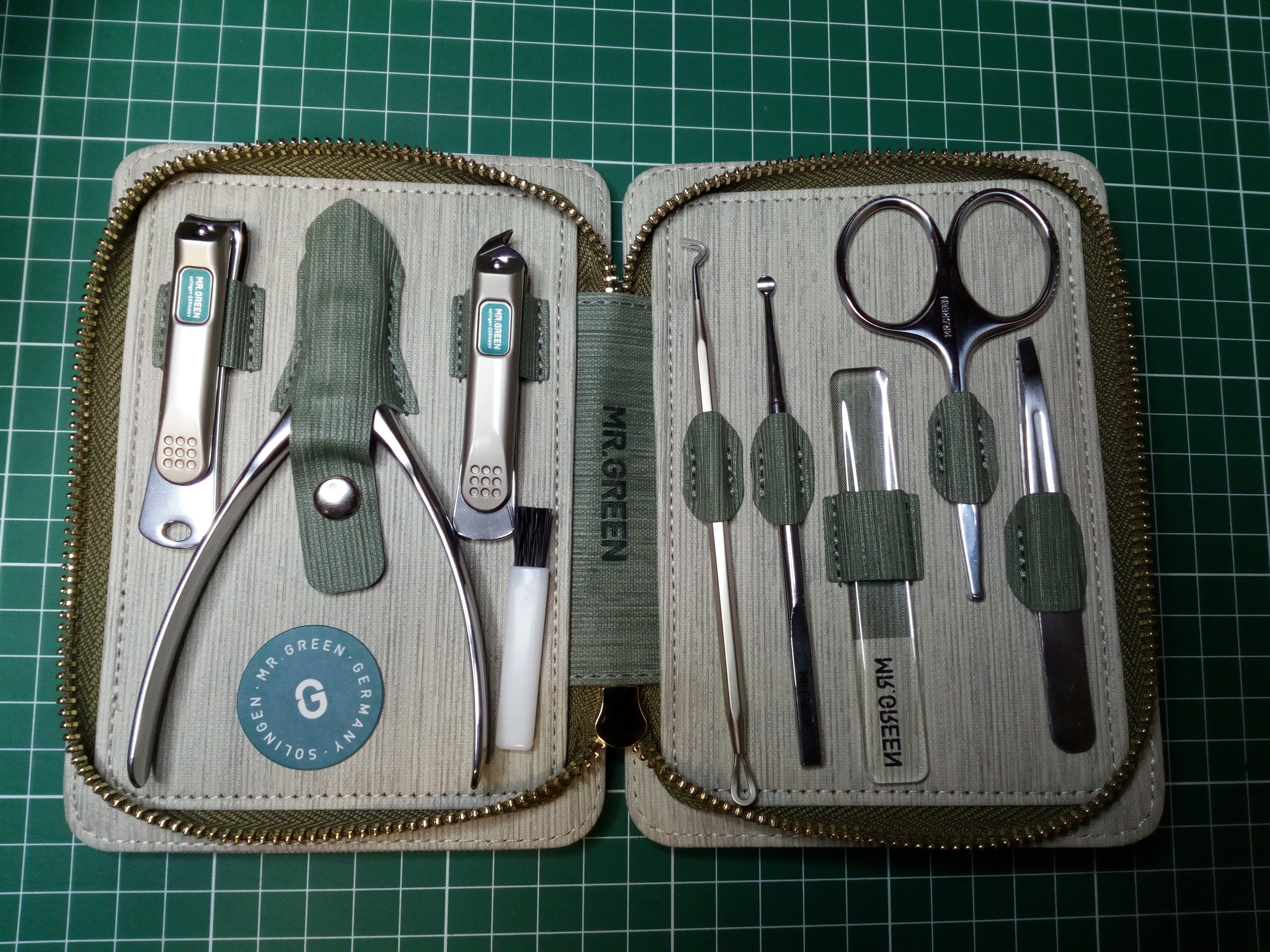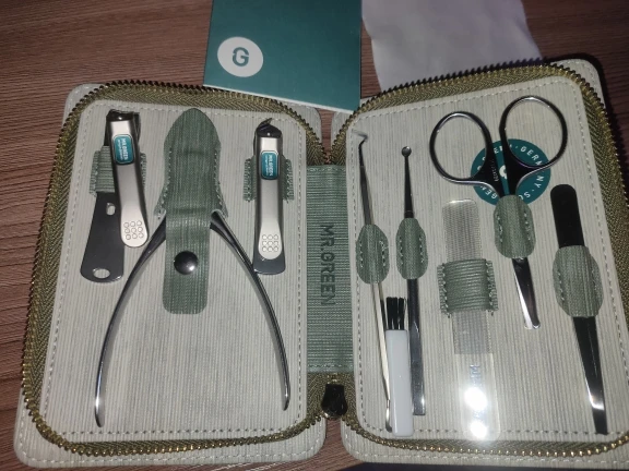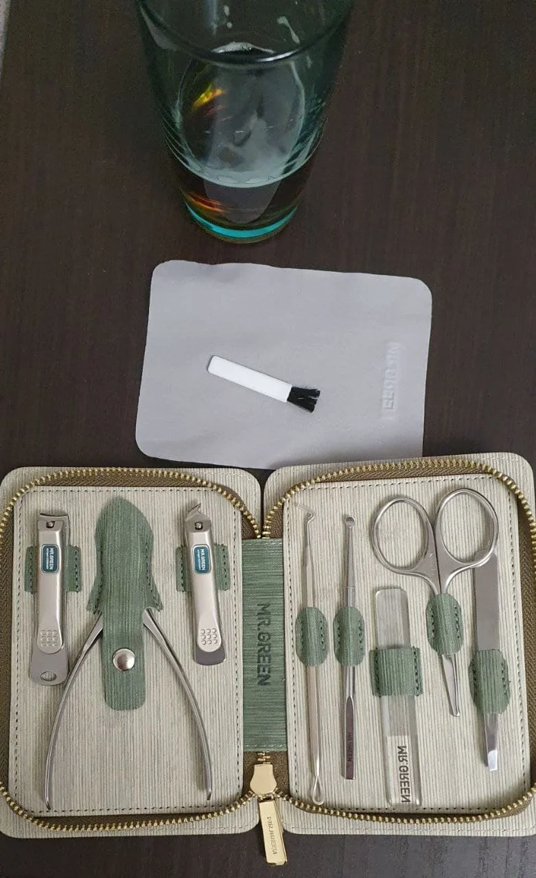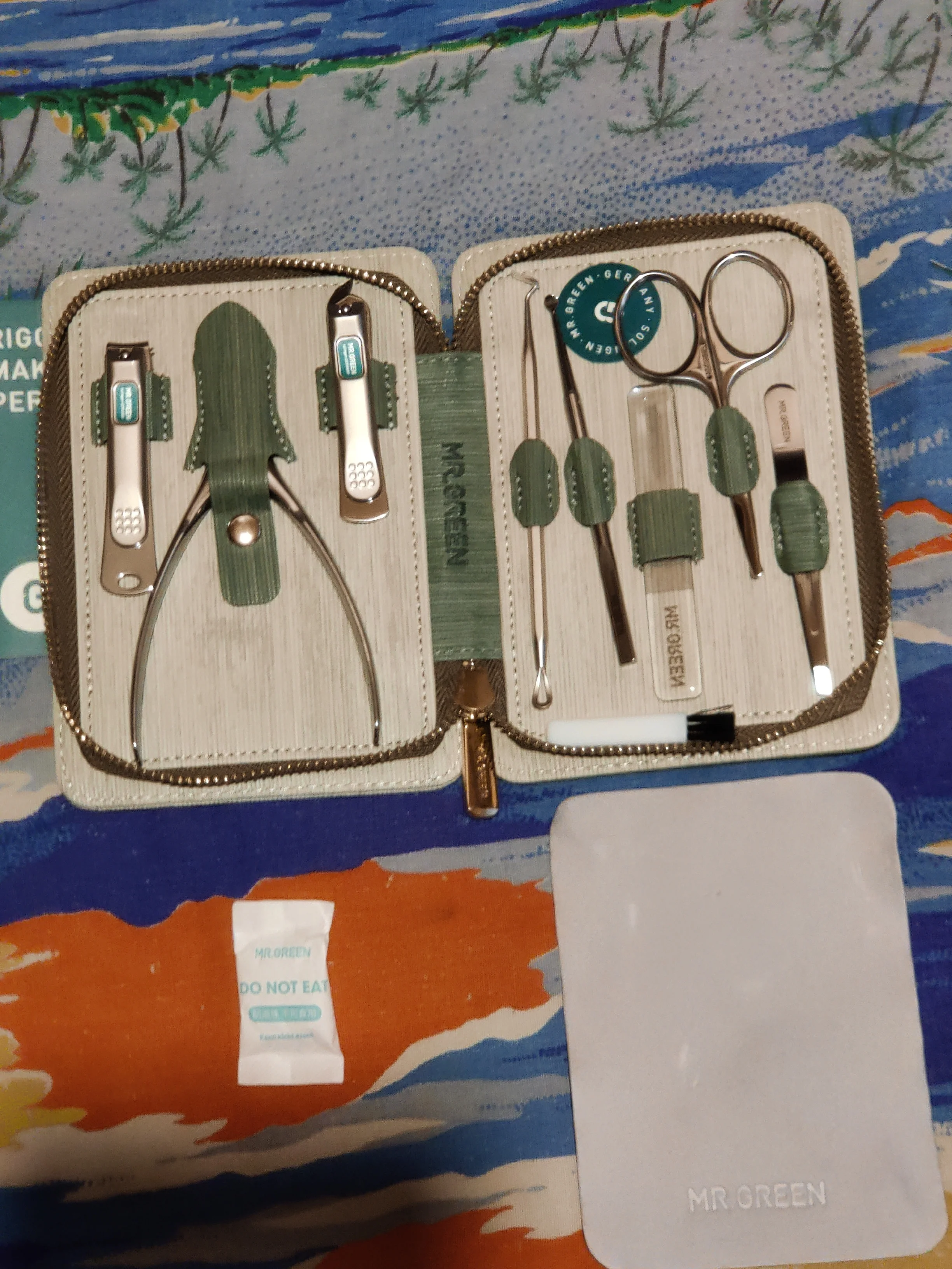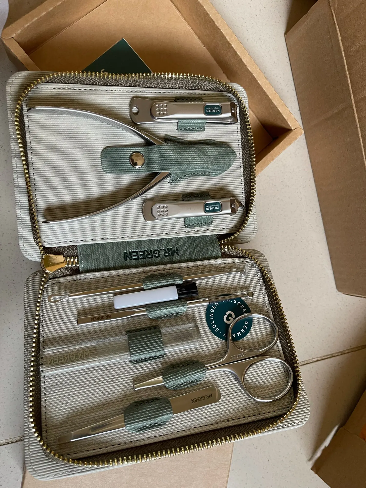 Великолепное качество маникюрного набора! Острая заточка кусачек, качественная стеклянная пилочка. У кусачек внутри тоже есть пилочки. В наборе есть ещё два инструмента для косметических процедур. У ножниц скруглённые концы, это безопасней, чем острые. Все инструменты выполнены на отлично, приятно держать в руках. Набор можно брать в подарок, качественный красивый футляр, фирменная упаковка. Прилагается вкладыш с обзором инструментов Mr.Green. Упаковано было очень хорошо, пузырчатая плёнка и транспортная коробка. Набор покупался на распродаже 11.11, было много заказов поэтому отправка задержалась, на всё ушло 7 дней.