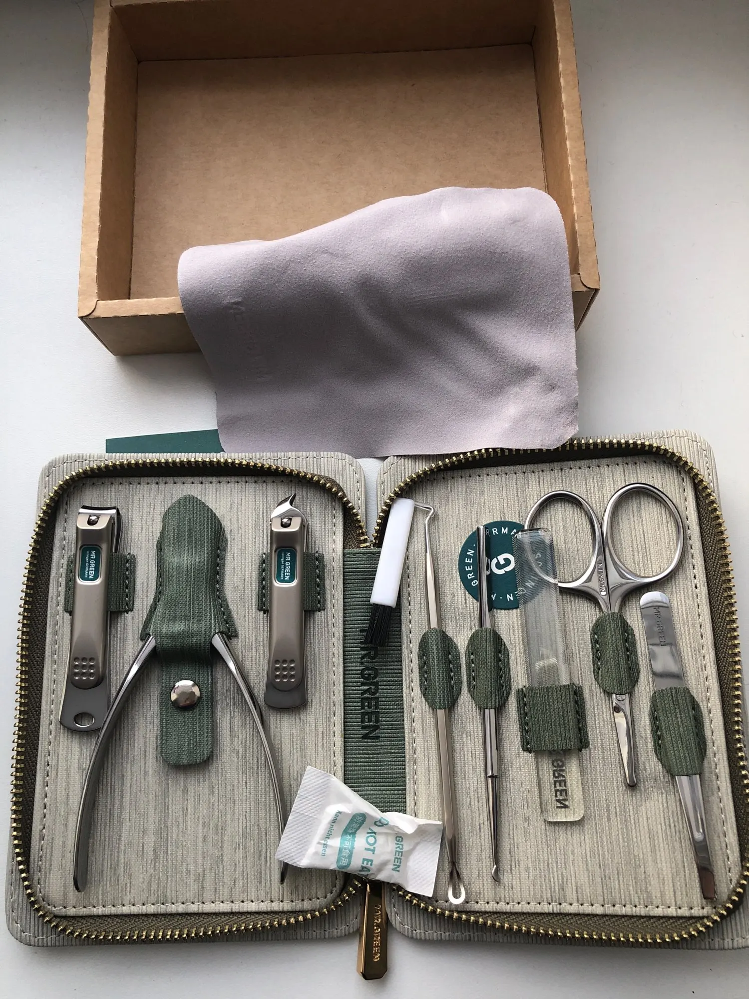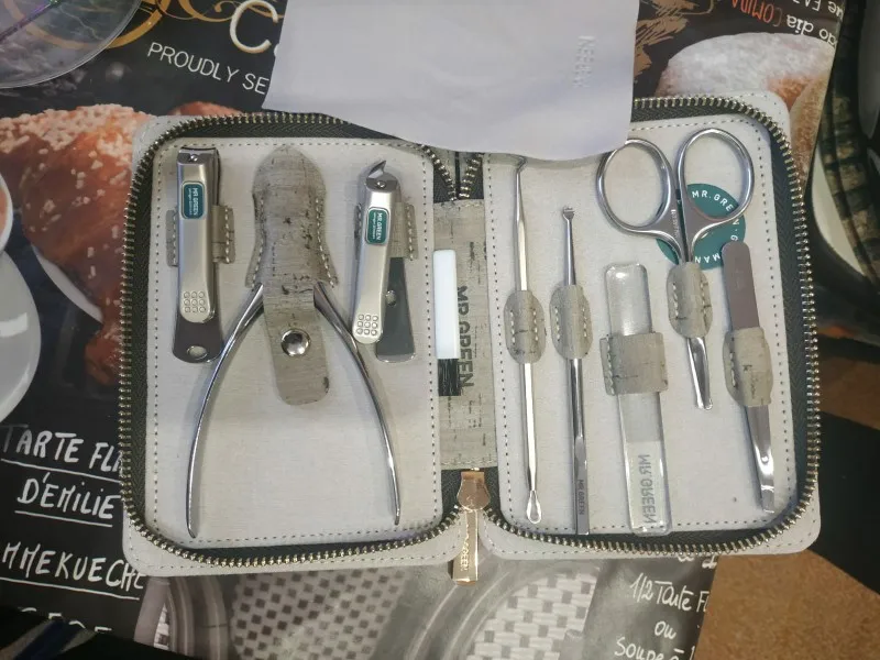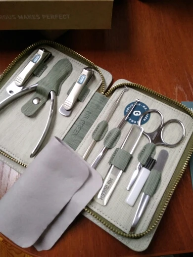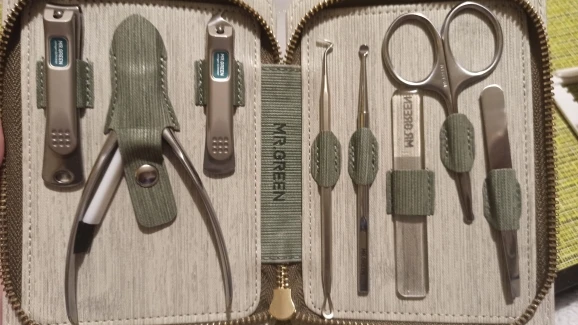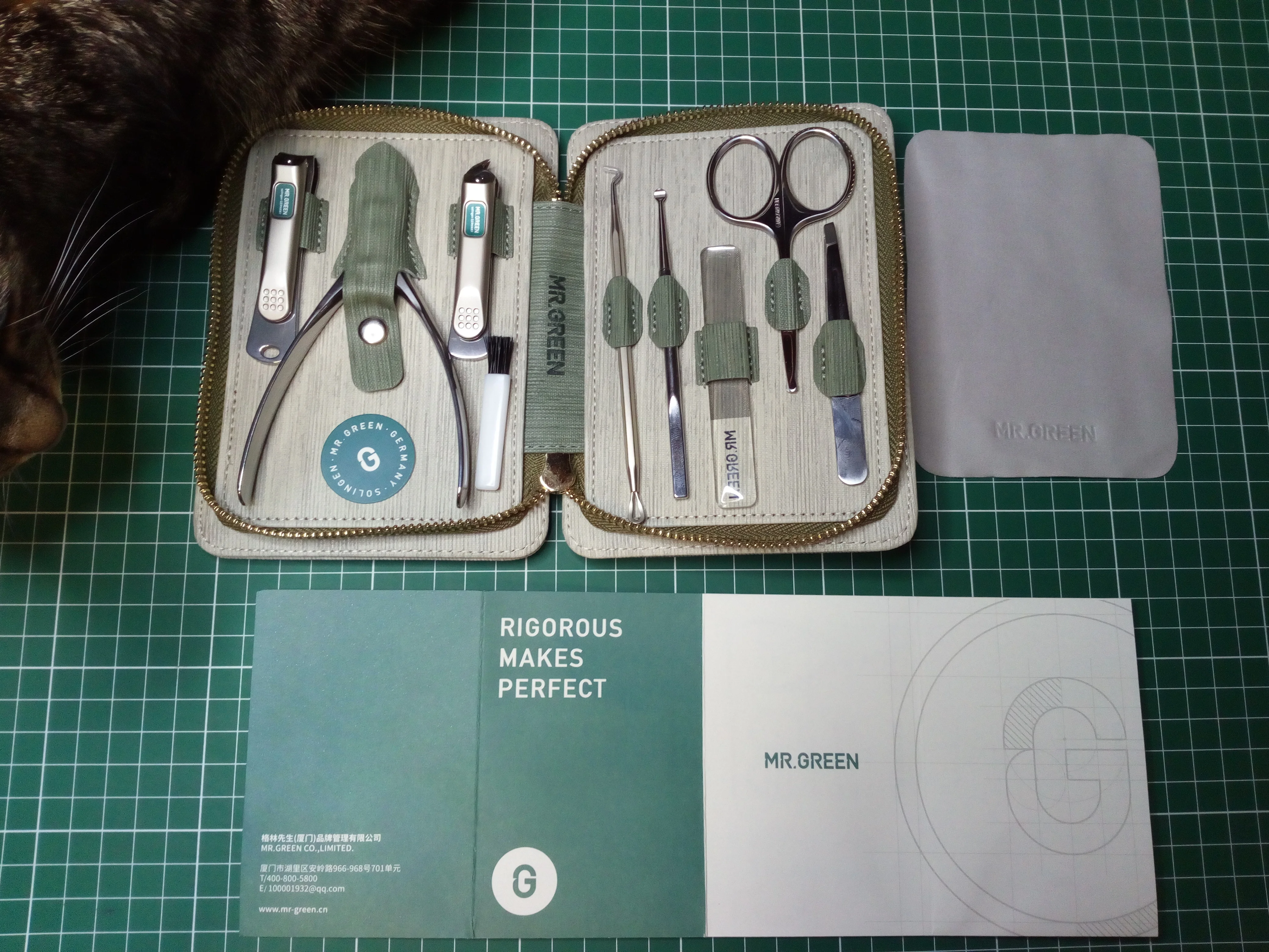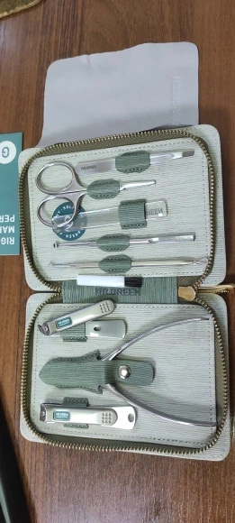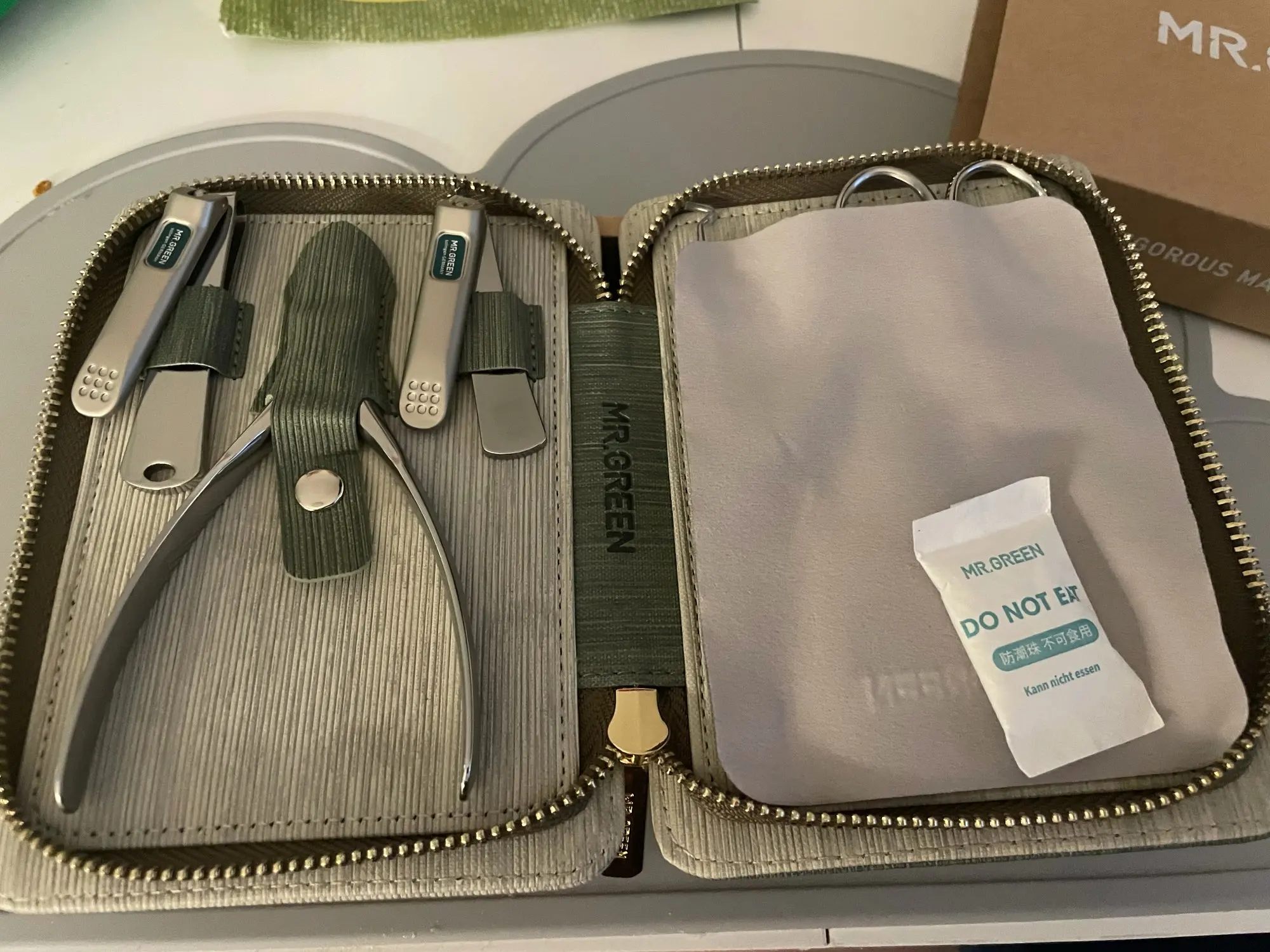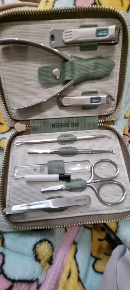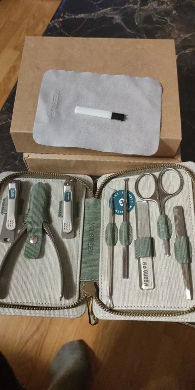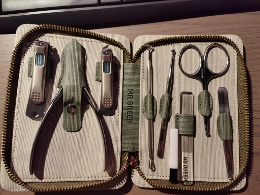 Великолепное качество маникюрного набора! Острая заточка кусачек, качественная стеклянная пилочка. У кусачек внутри тоже есть пилочки. В наборе есть ещё два инструмента для косметических процедур. У ножниц скруглённые концы, это безопасней, чем острые. Все инструменты выполнены на отлично, приятно держать в руках. Набор можно брать в подарок, качественный красивый футляр, фирменная упаковка. Прилагается вкладыш с обзором инструментов Mr.Green. Упаковано было очень хорошо, пузырчатая плёнка и транспортная коробка. Набор покупался на распродаже 11.11, было много заказов поэтому отправка задержалась, на всё ушло 7 дней.