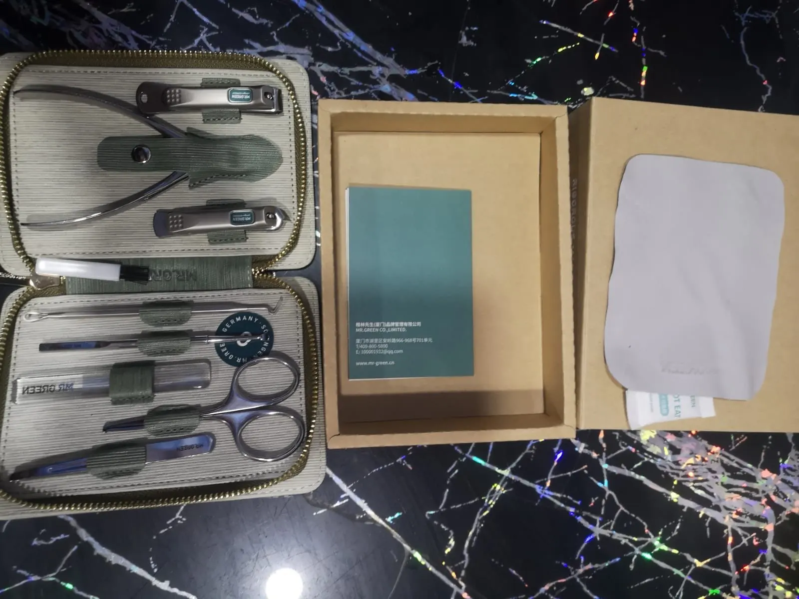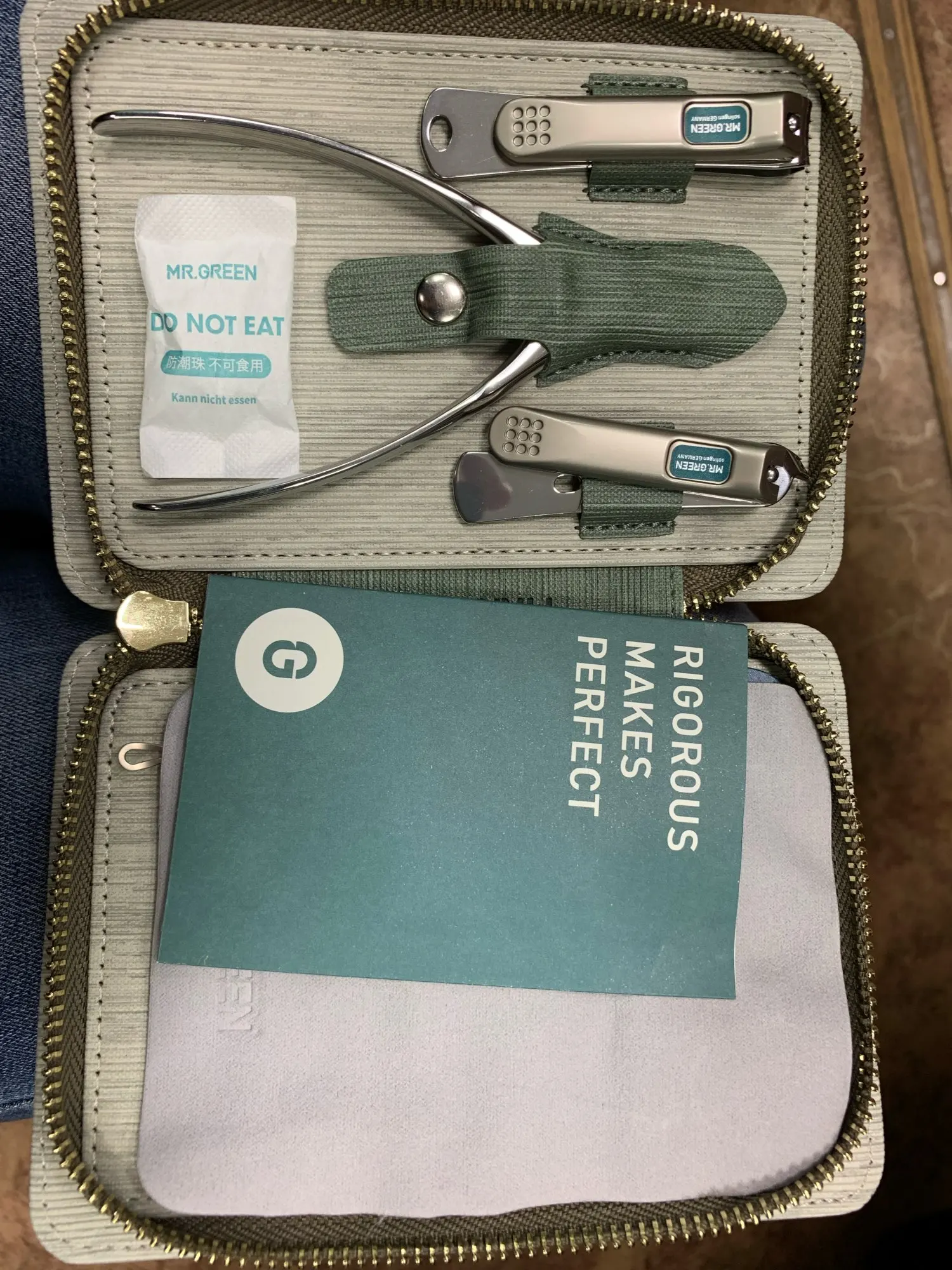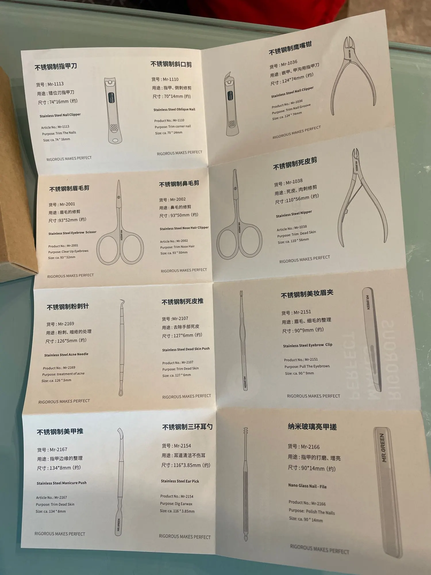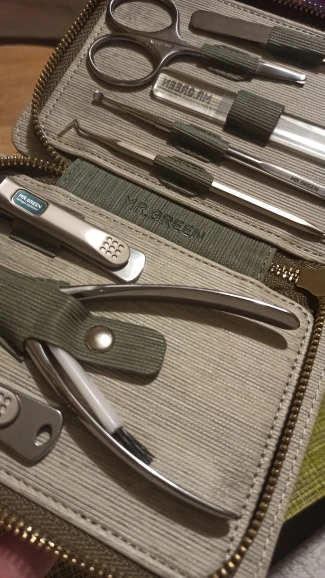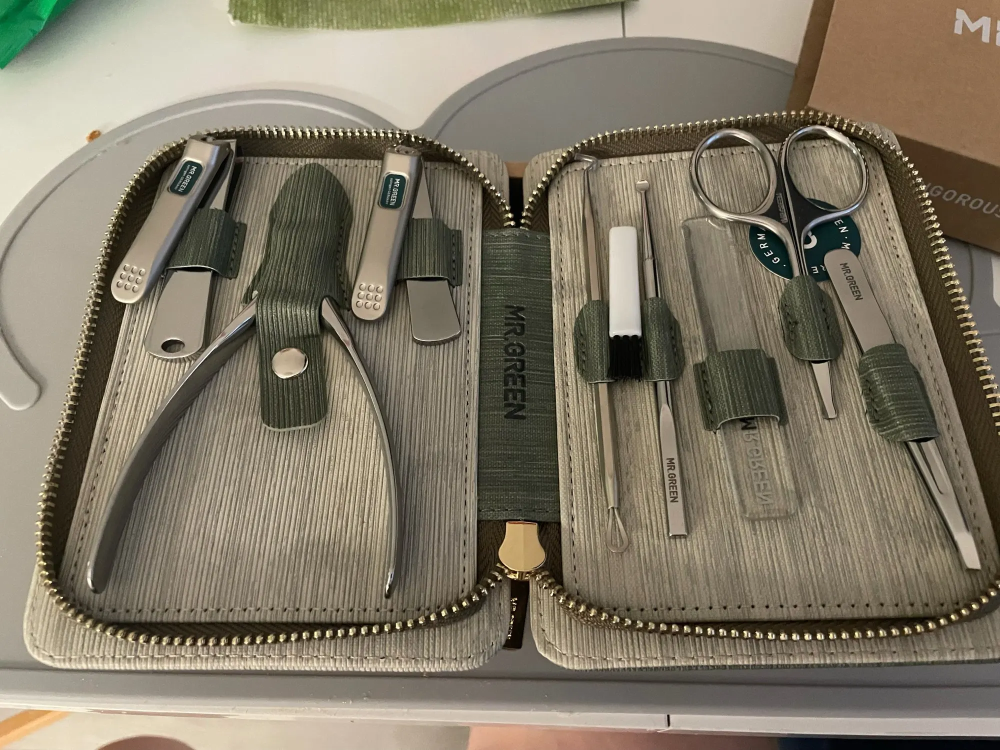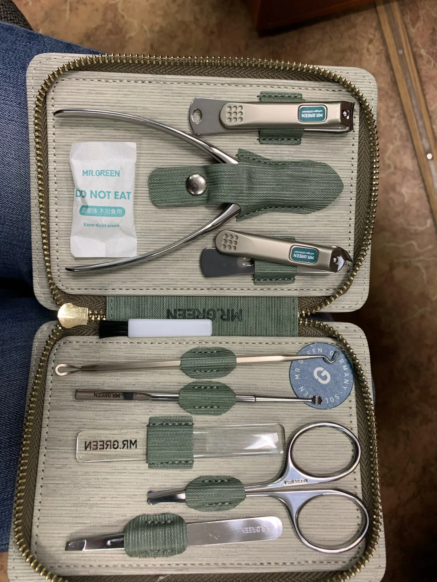 Великолепное качество маникюрного набора! Острая заточка кусачек, качественная стеклянная пилочка. У кусачек внутри тоже есть пилочки. В наборе есть ещё два инструмента для косметических процедур. У ножниц скруглённые концы, это безопасней, чем острые. Все инструменты выполнены на отлично, приятно держать в руках. Набор можно брать в подарок, качественный красивый футляр, фирменная упаковка. Прилагается вкладыш с обзором инструментов Mr.Green. Упаковано было очень хорошо, пузырчатая плёнка и транспортная коробка. Набор покупался на распродаже 11.11, было много заказов поэтому отправка задержалась, на всё ушло 7 дней.