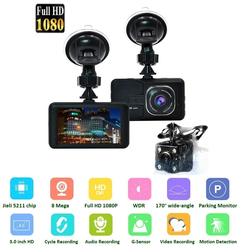 Запись hd-видео в 1080P mode24/fps.170The Широкий формат объектив фронтальной камеры, может снимать четкие HD-видео. Видео и аудио Автоматически записываются в бесконечную петлю и сохранены на карте памяти. Запись дорожных происшествий, живописных путешествий, неожиданных моментов или любых социальных достойных видео.