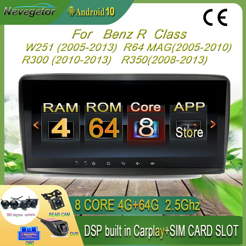 Автомобильный мультимедийный плеер 10,25 дюйма, Android 10, для Mercedes Benz R class W251R280R300R320R350R500, Wi-Fi радио с Bluetooth и GPS, стерео