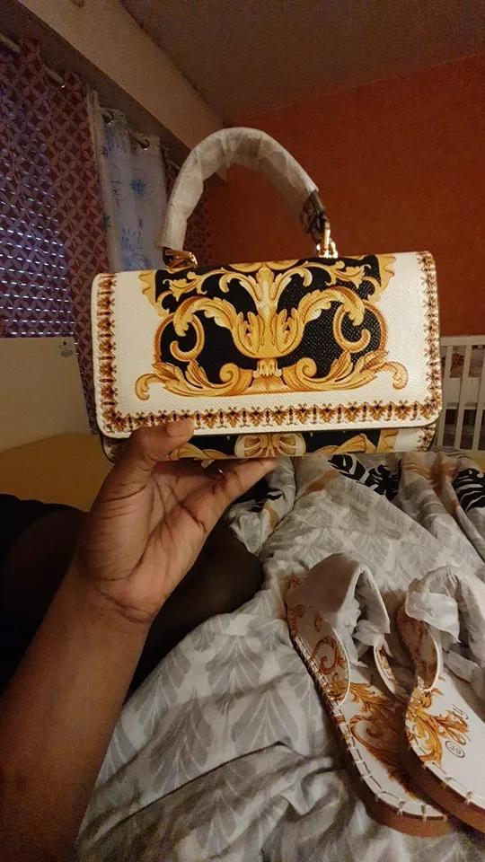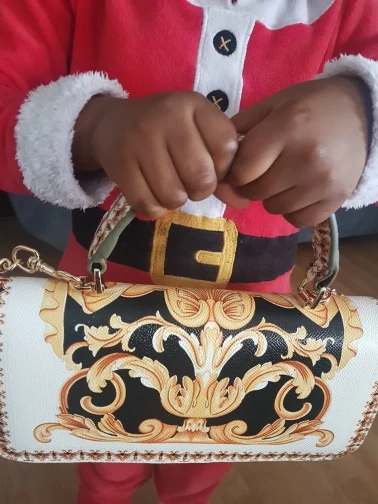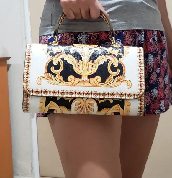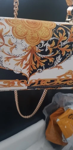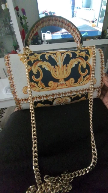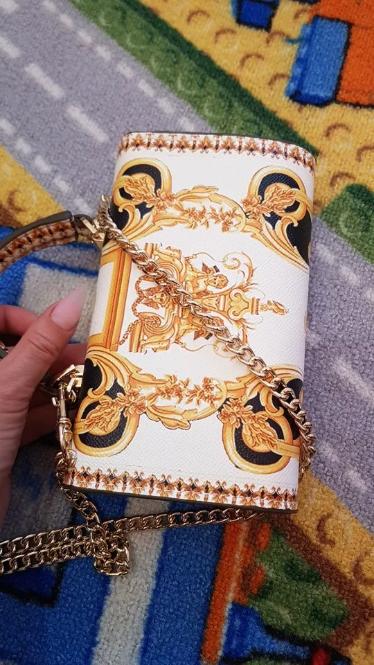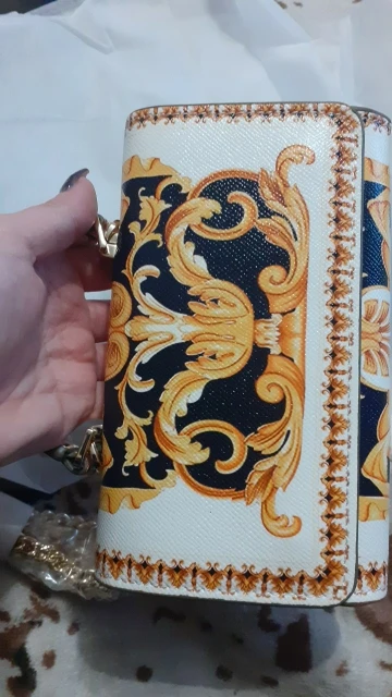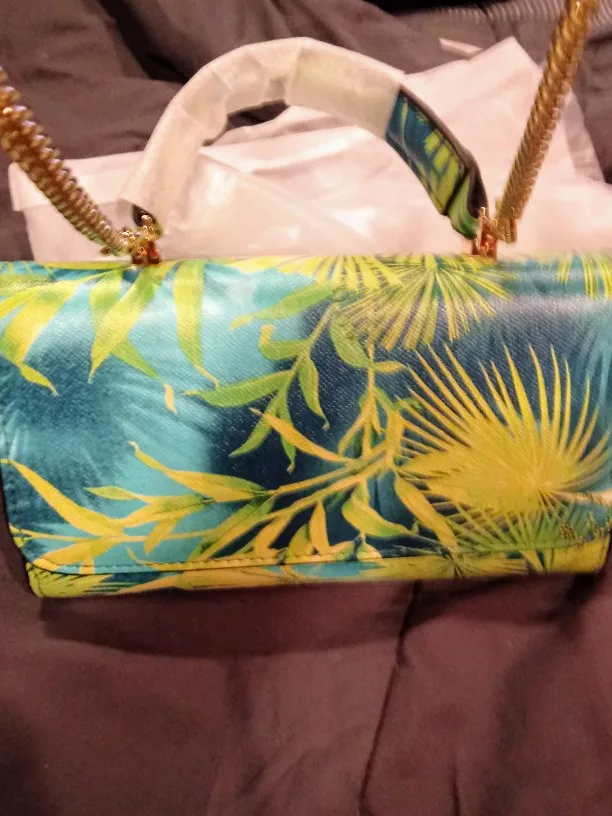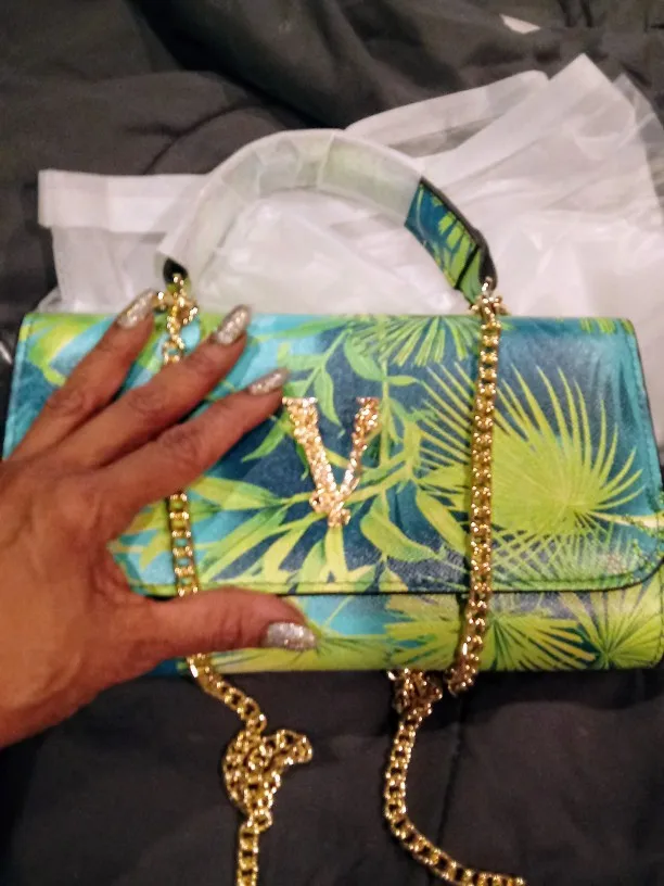 Сумка точно такая же, как на фото. Правильный размер. Цвета такие же яркие Поставляется с золотой цепочкой, как на изображении. Тяжелая цепь. Полиуретановая кожа с принтом в виде листьев джунглей и очень мило выглядит как кошелек Версаче, чтобы соответствовать моим леггинсам. Я также добавила v-образную брошь, и она стала еще лучше. Примечание: V добавляется мной, магазин не является аффилированным лицом бренда V. IG: VegasDollKouture. Спасибо за быструю доставку! Я рекомендую! Перед покупкой проверьте таблицу размеров.