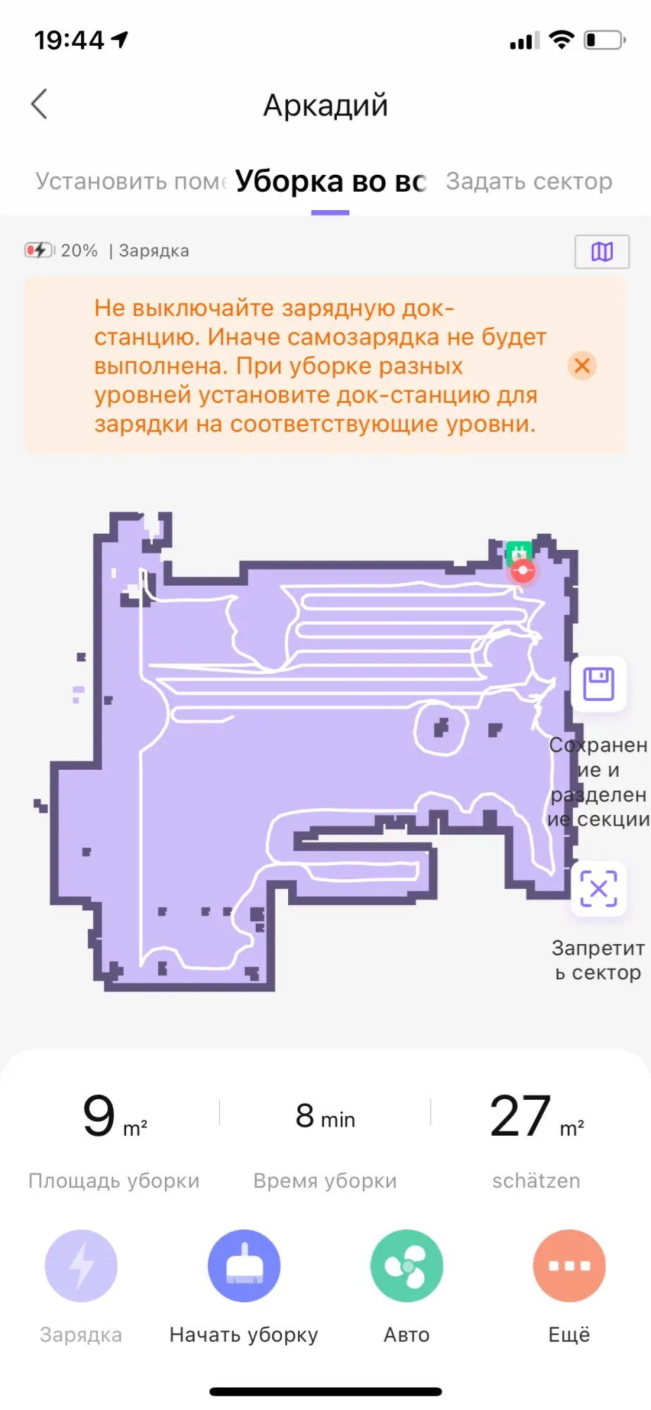 Бран перед НГ. Принес курьер на 5 или 6 день. Зарядка 54%. Сразу подключился к телефону, обновил приложение. Карту строит довольно точно, но приписывает квадратные метры. Пыли находит довольно много, на ковер вскорабкивается легко. Не из дома еще не запускал.