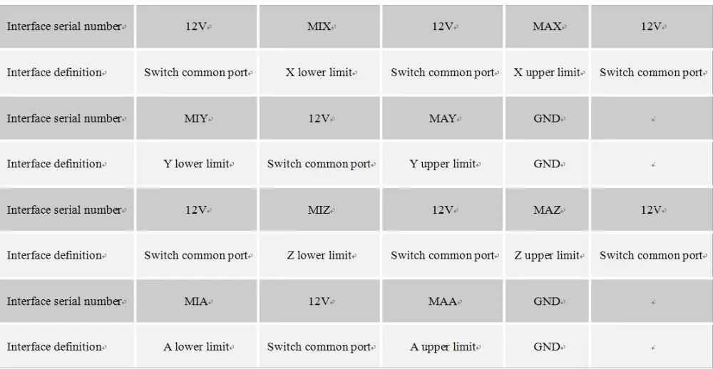 P) выход сигнала управления шаговым двигателем по оси Z, определение CK + \ CK-\ DIR + \ DIR-, соответственно для положительного импульса, отрицательного импульса, положительного направления, отрицательного направления, плата использует общий метод подключения анода, поэтому CK + и DIR + соединены вместе с 5 В на плате, эта плата не поддерживает общий катодный метод подключения.