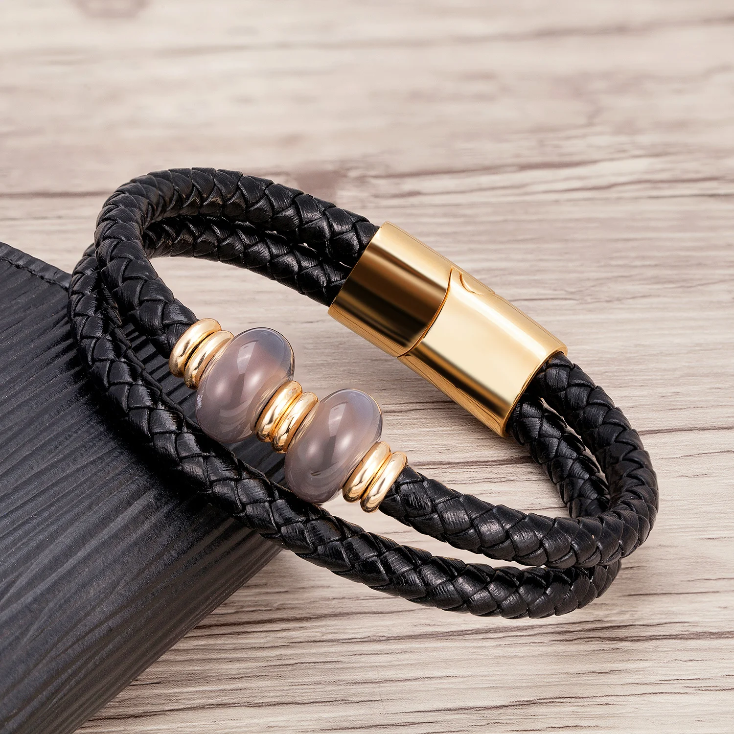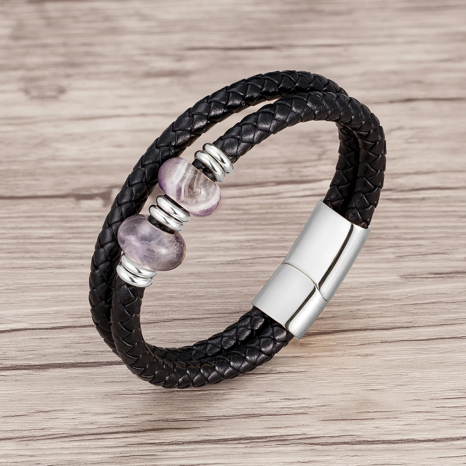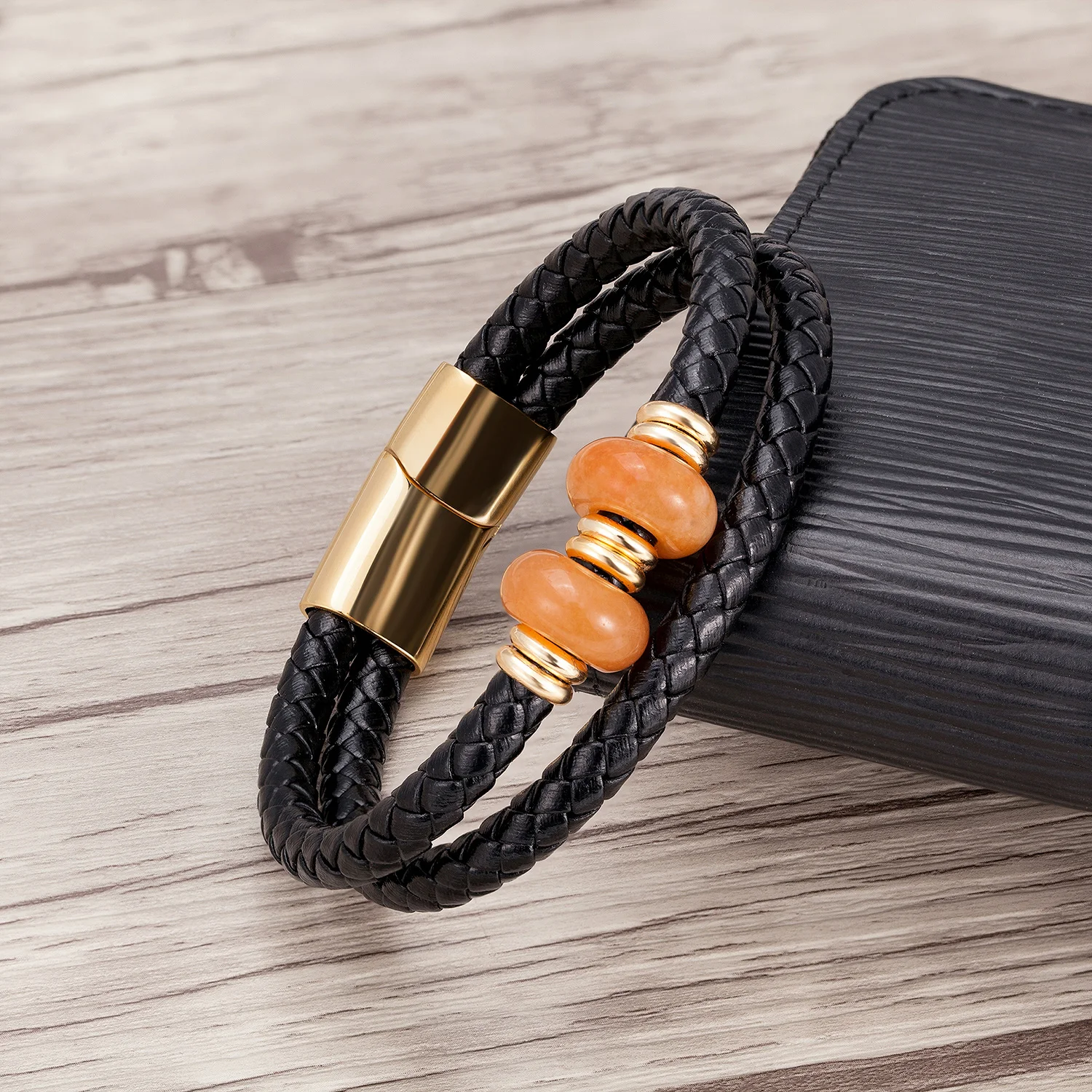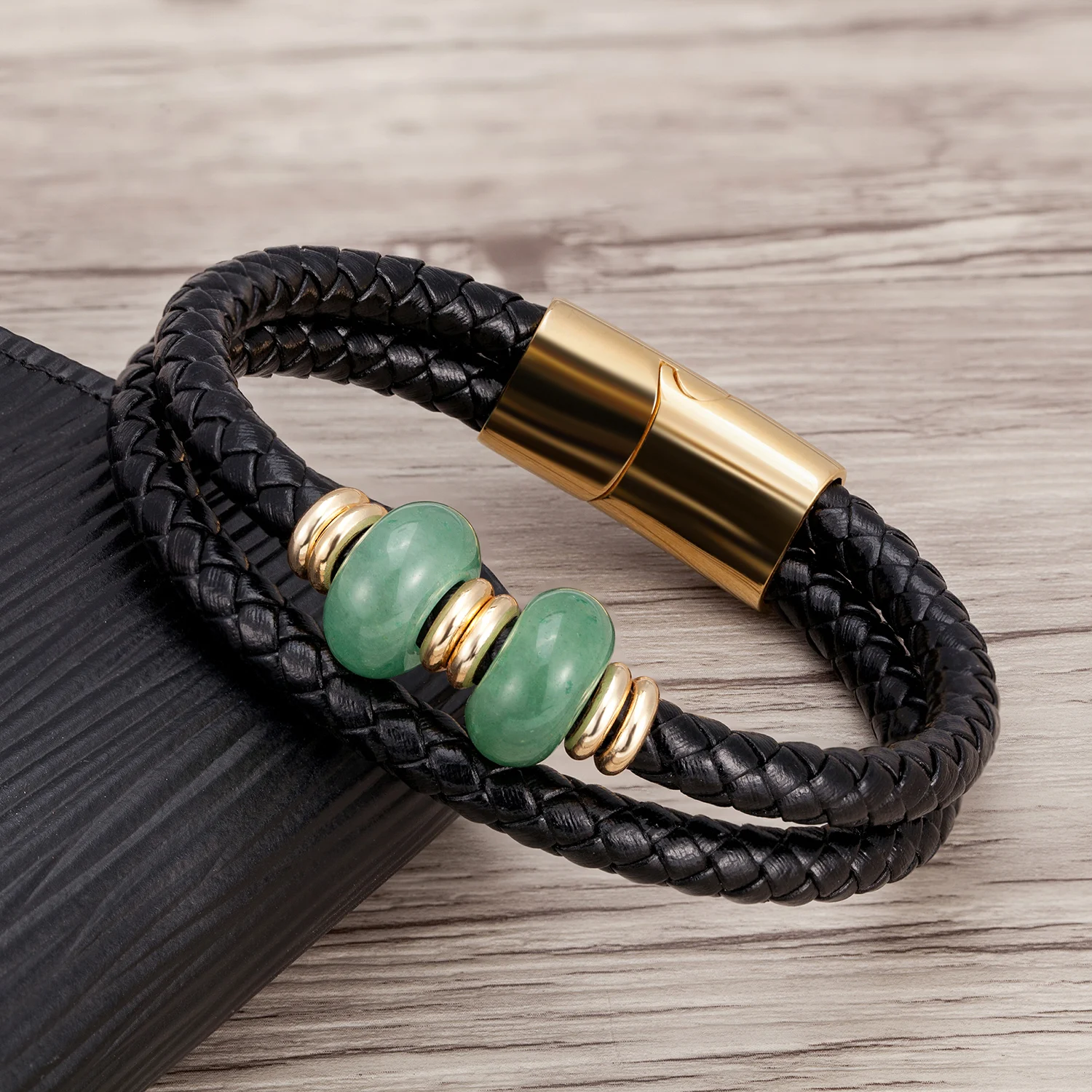 Браслет-цепочка мужской из натуральной кожи с натуральным камнем и магнитной застежкой