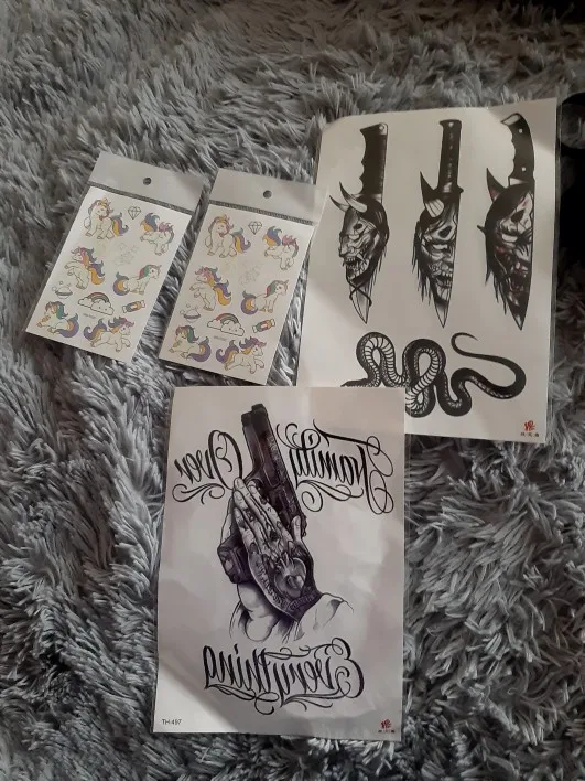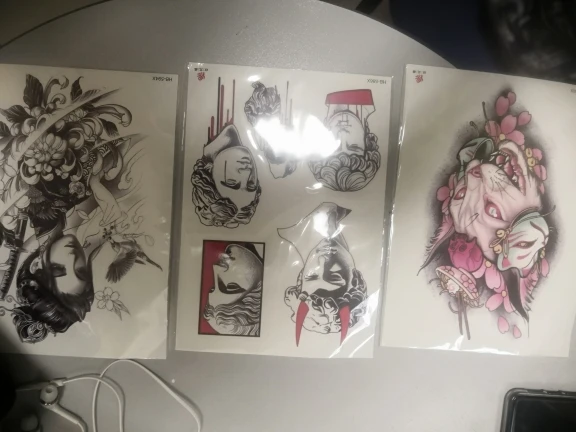 Заказ пришел быстро, 2 недели до Москвы. Рисунки красивые, но сильно увеличенные, из-за этого линии нечеткие. Но это проблема всех временных татуировок на алиэкспресс, за такие деньги очень даже хорошее качество. Стойкость конкретно у этих еще не проверяла, но думаю, недели ~1,5 как у всех, если не тереть мочалкой.