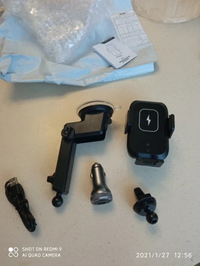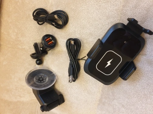 Товар качественный, видно по нему.Продавец по просьбе положил крепление прищепки. Есть два шнурка. Один юсб, другой как штекер в самсунг.Правда шнурки не длинные, на стекло, если крепление ставить, шнурок до прикуривателя не дотянется.Придётся дозаказать. Все срабатывает, зарядка беспроводная работает хорошо, заряжает. Брал 15в. По доставке, как всегда наша почта отличилась, шло почти месяц. Как то так. Продавец молодец. Товар очень хороший. Рекомендую.