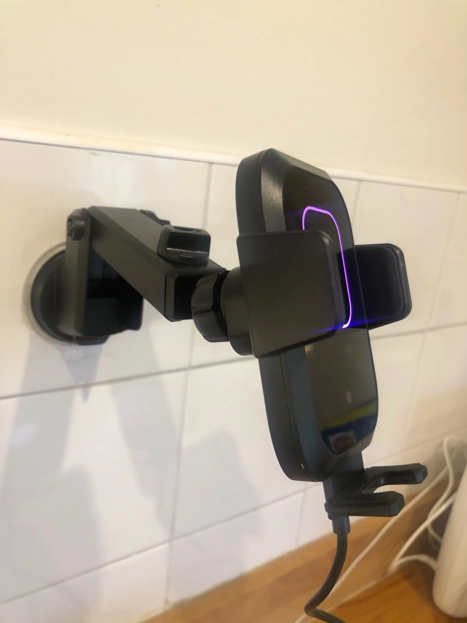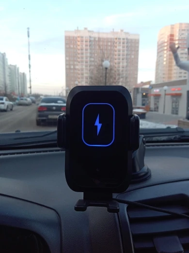 Работает, цвета мигают хаотично, то розовый, то синий, пока не пойму от чего это зависит. Брала на присоске, продавец и другой крепёж положил в подарок)) Заряжает медленно конечно, и это ещё дома, а в машине...такое себе. Но вообще идея прикольная, выглядит достойно, сам раздвигается, когда подносишь телефон)) поиграемся вообщем, крепёж качественный. Можно дозаказать штучку для увеличения мощности, может с ней шустрее заряжать будет..