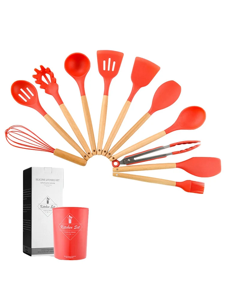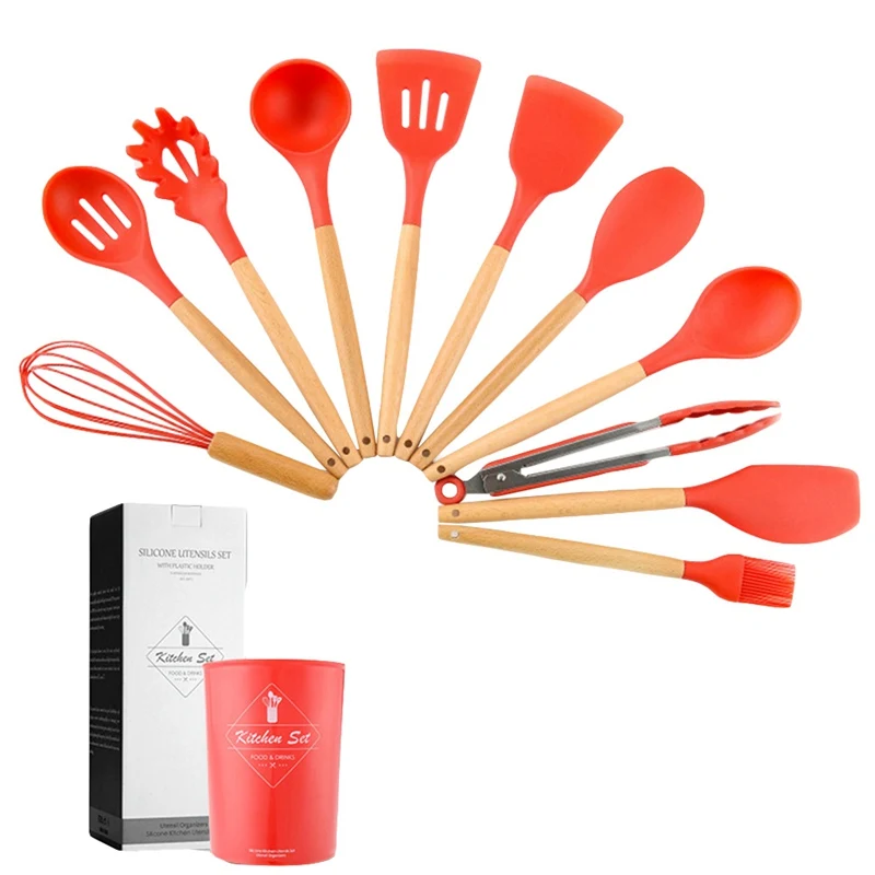 Набор силиконовых кухонных принадлежностей, 11 шт., ручка из цельного дерева с ящиком для хранения, аксессуары для кухонных инструментов