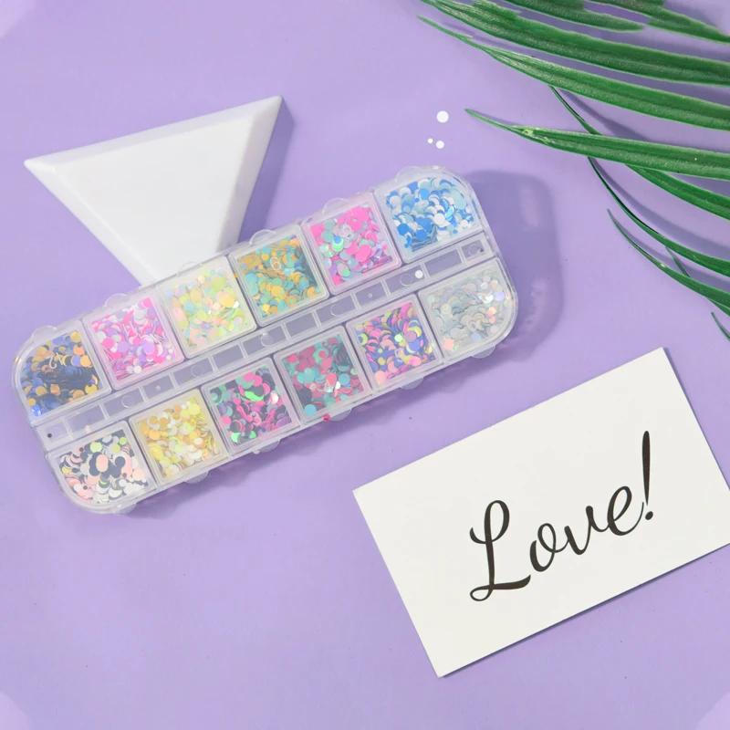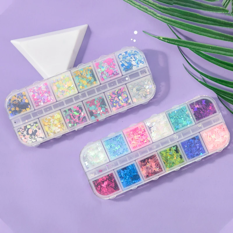 12 сеток/набор Голо ногтей блестки блестящие 3D тонкие бабочки/Круглые красочные хлопья для ногтей аксессуары мульти-формы PH08
